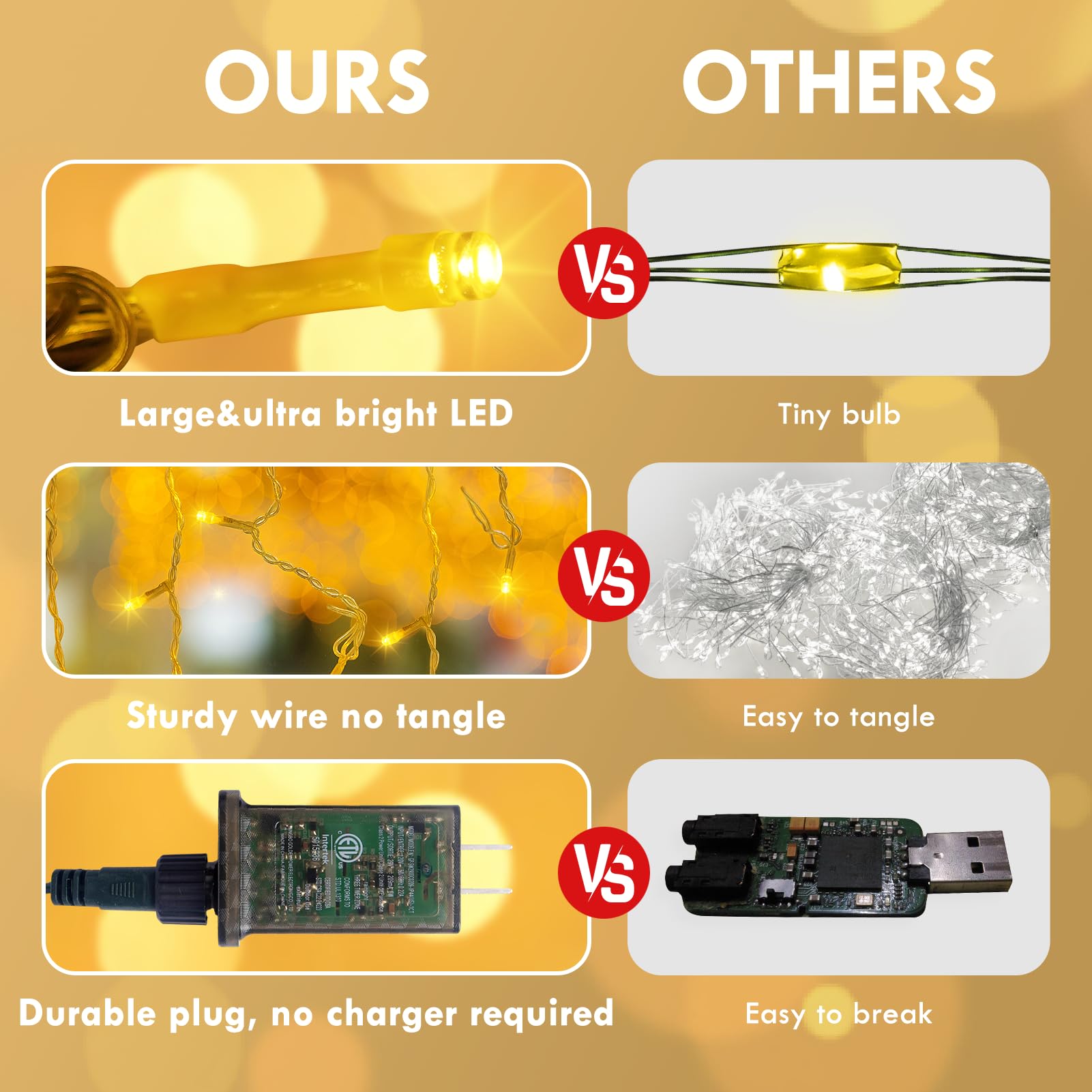 • Waterproof Design: Led christmas lights features an advanced waterproof construction with an IP44 rating. Each LED bulb, connecting wire, and the control box are encased in durable, water-resistant materials, protecting against rain, snow, and humidity. However, please note that the plug is not waterproof and should be kept in a dry location. This robust waterproof design allows you to confidently decorate your garden, patio, or any outdoor space.