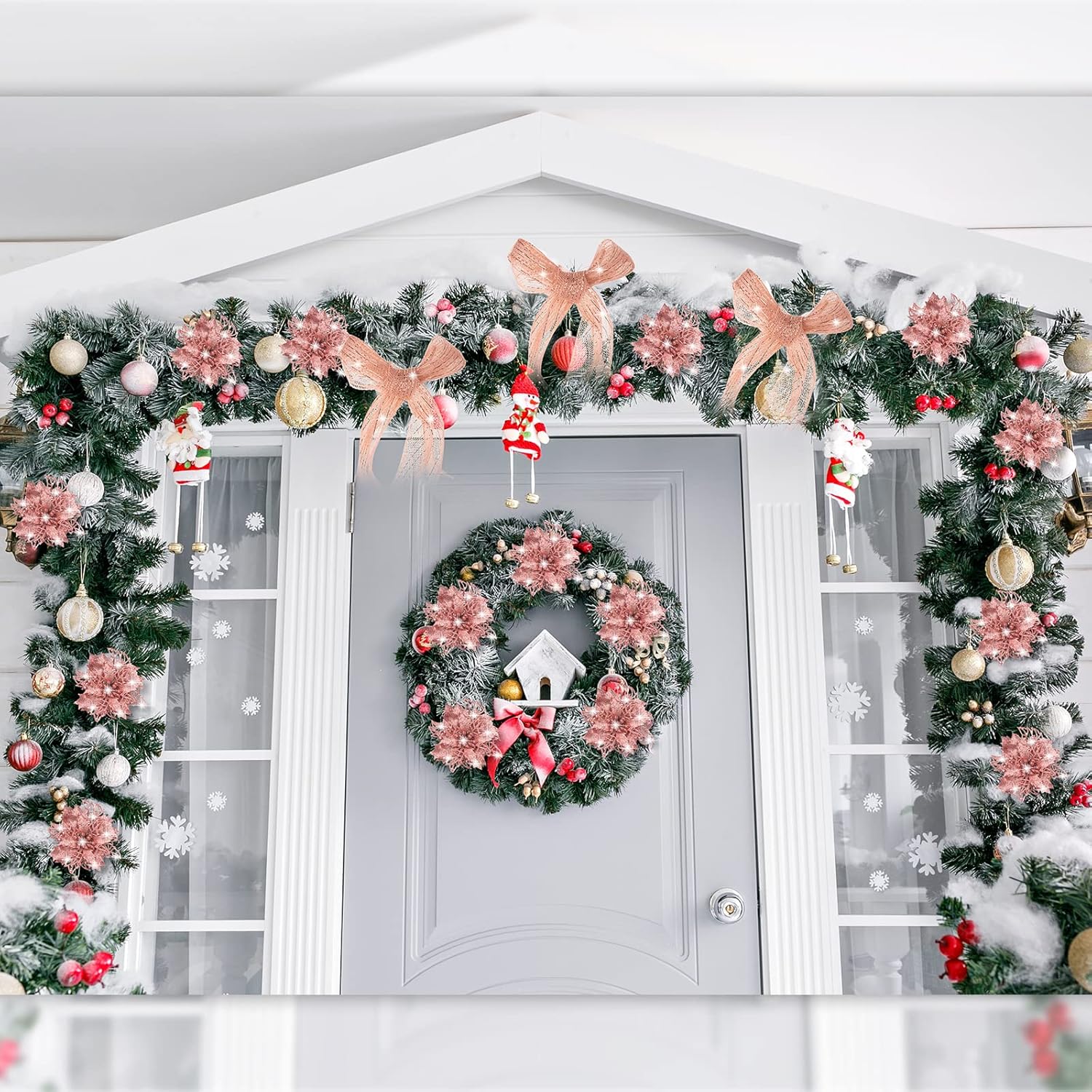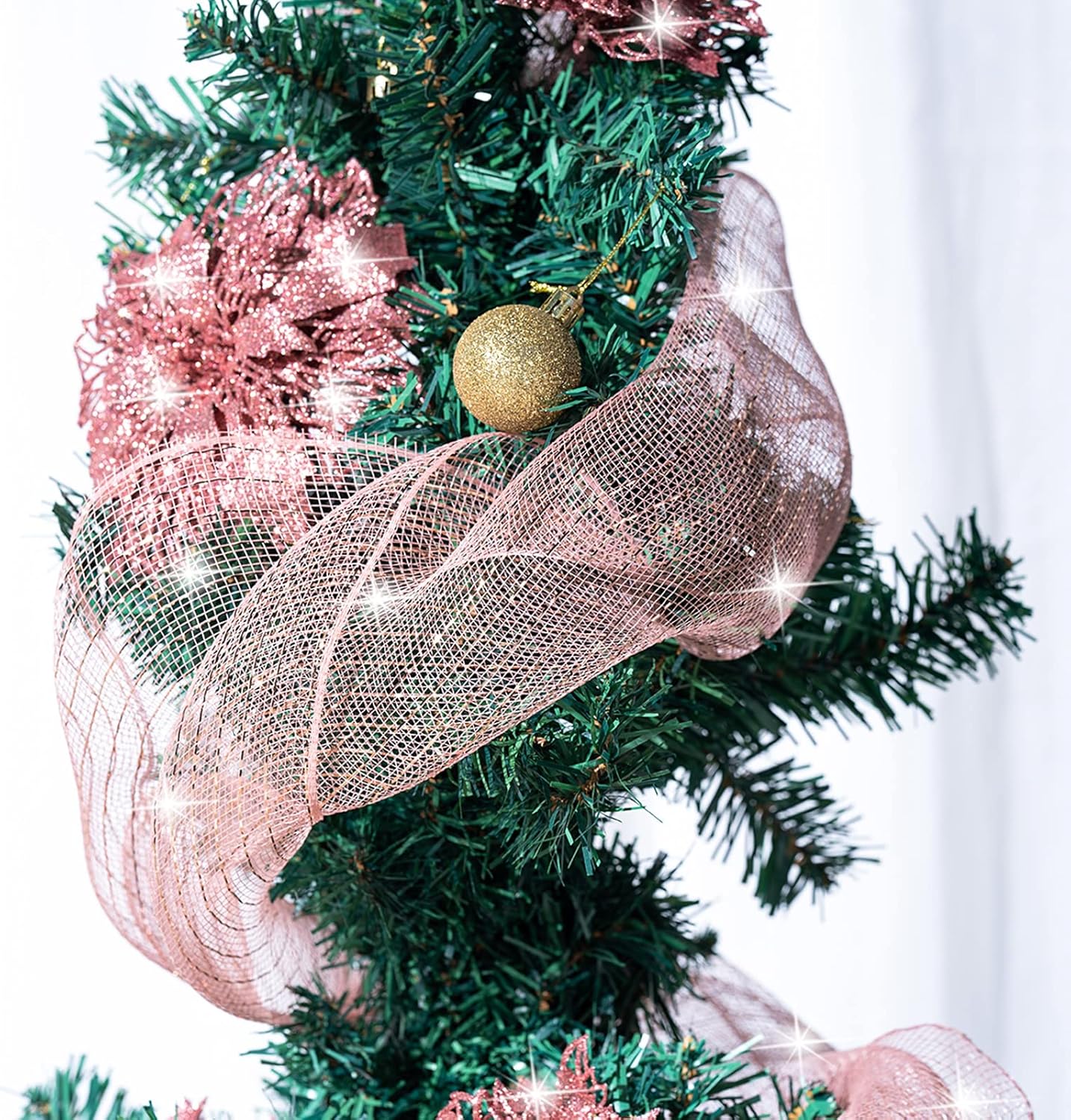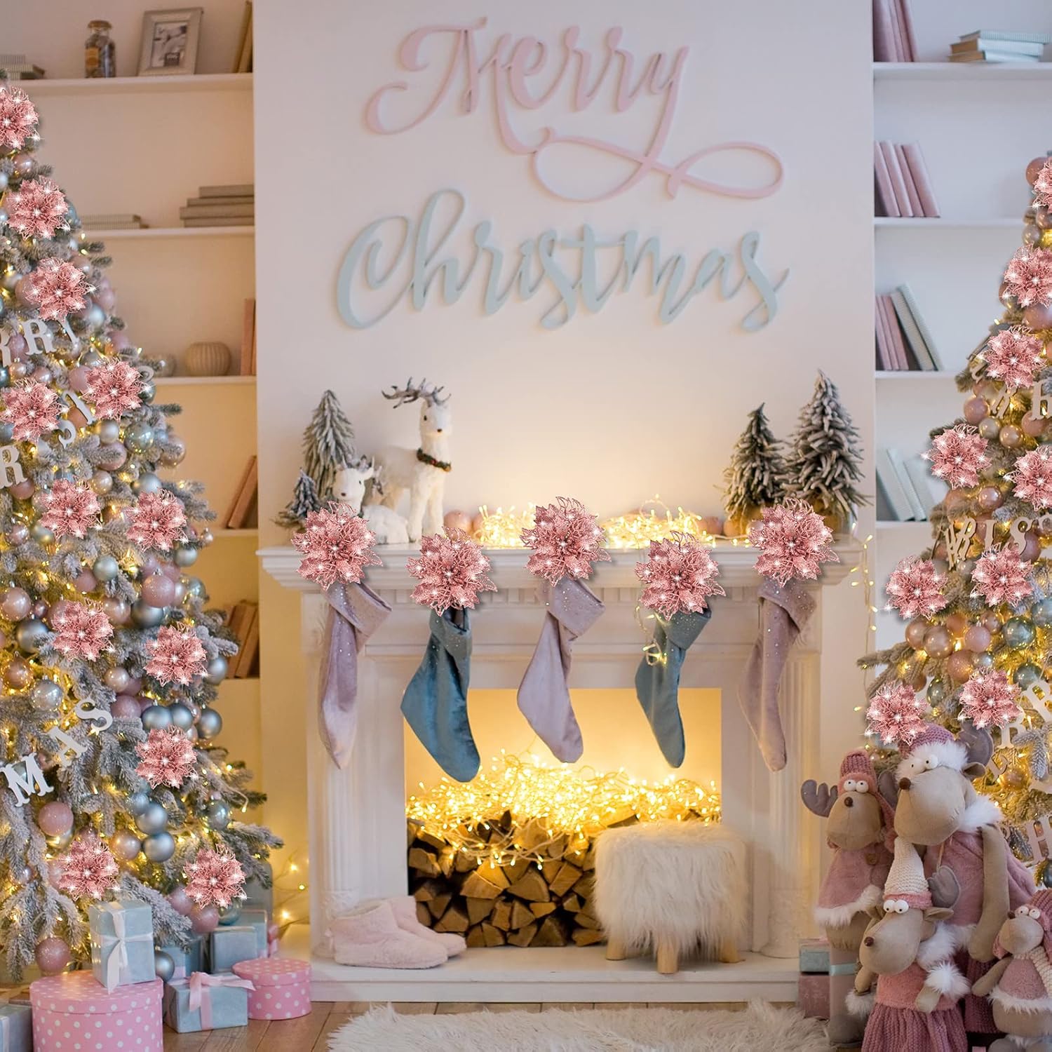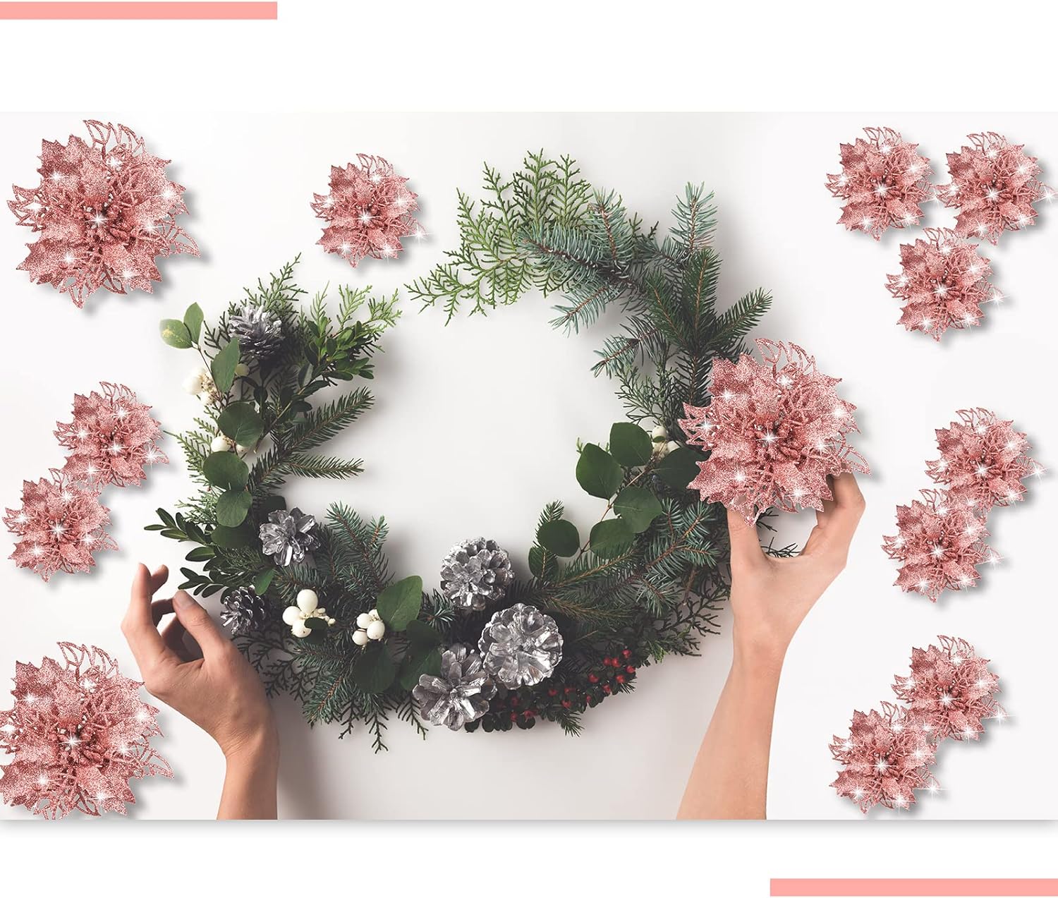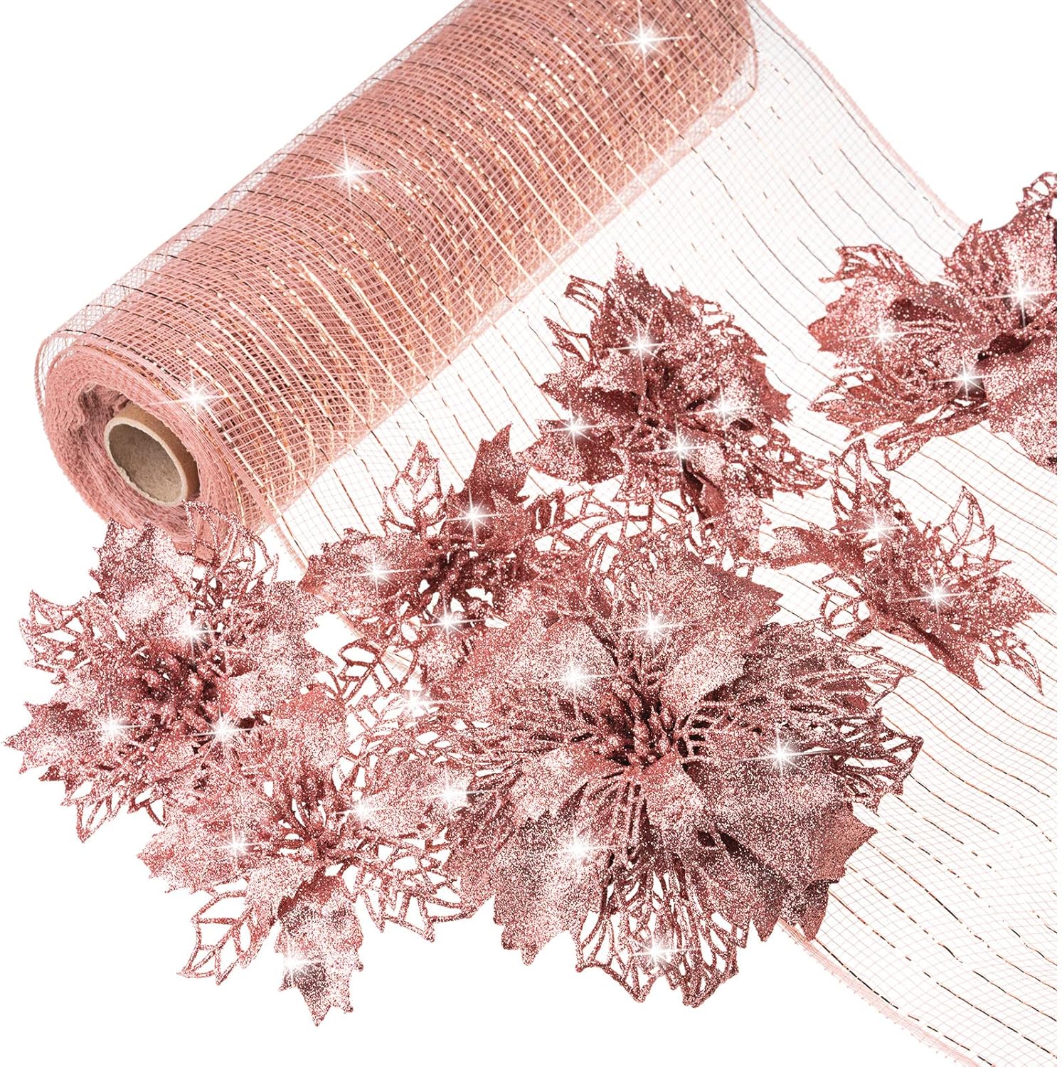 Yeshone 20 Pcs Christmas Glitter Poinsettia Faux Flowers with 30 ft Christmas Mesh Ribbon Rolls Christmas Tree Ornament Christmas Flowers Xmas Tree Wreaths Decor for Christmas Wedding(Rose Gold)