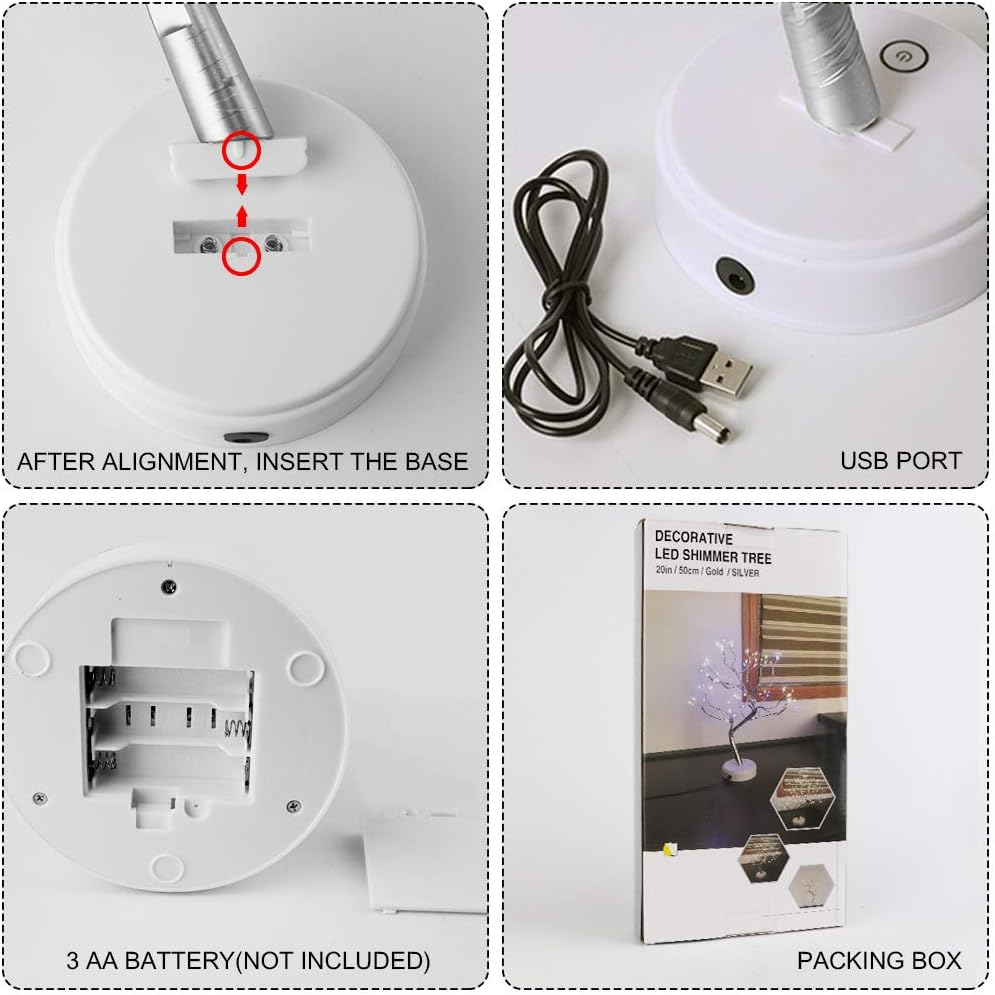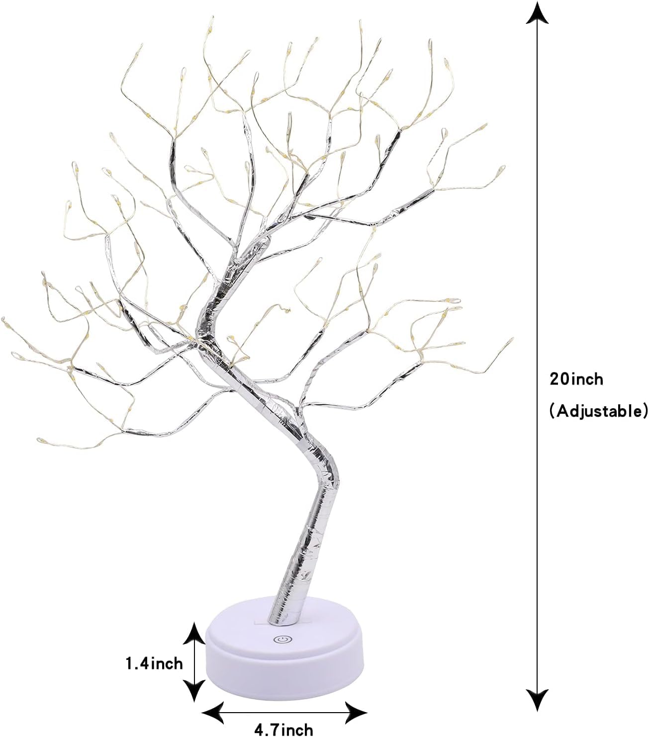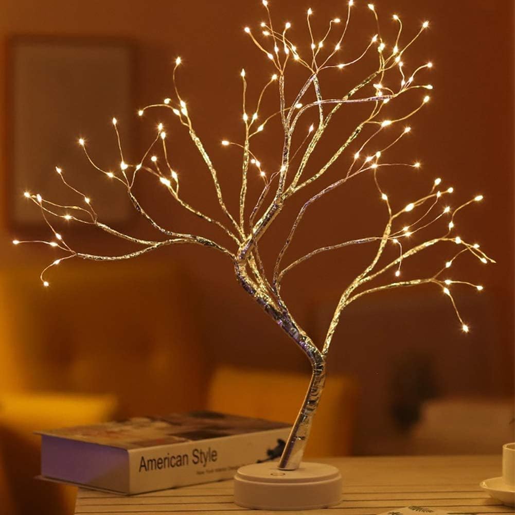【Romantic Ambiance Light for Room Decor】18-20in height, 108pcs warm white LED, 16 branches, silver tree, touch sensor switches. This beautiful artificial twinkle tree light can be used as night lights, nightstand lights, desk lamp, an ideal bedroom, living room decoration. Its glow will bring you joy and warmth.【DIY Any Shape You Want】Bonsai style design, natural tree shape will add vitality to your home. The branch is made of copper wire, easy to fold but not easy to break and you can bend the branches into any shape you like. Also, it could be dotted with some novelties, such as paper cranes, jingle bells, even the banknotes, etc. Just style the cute tree as what you imagine.