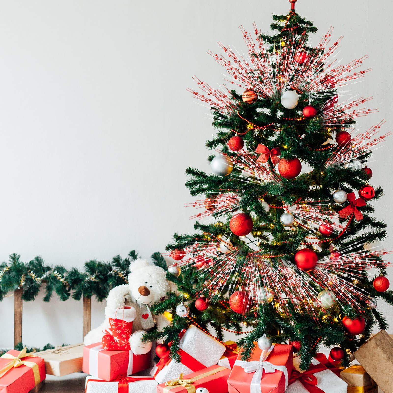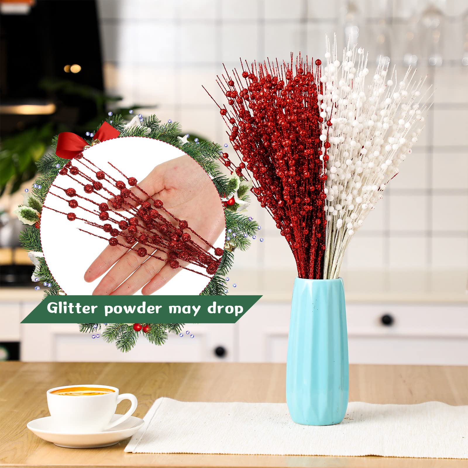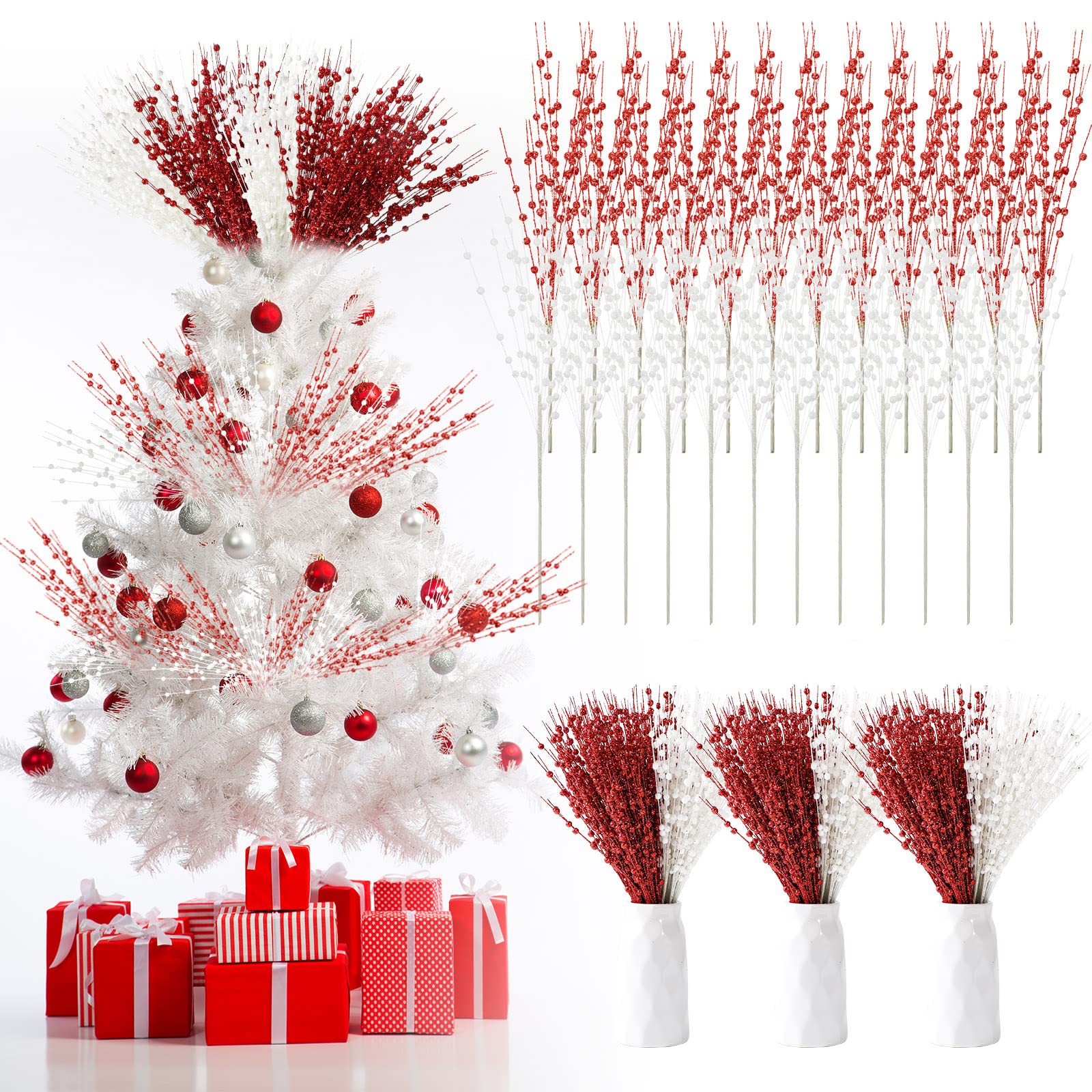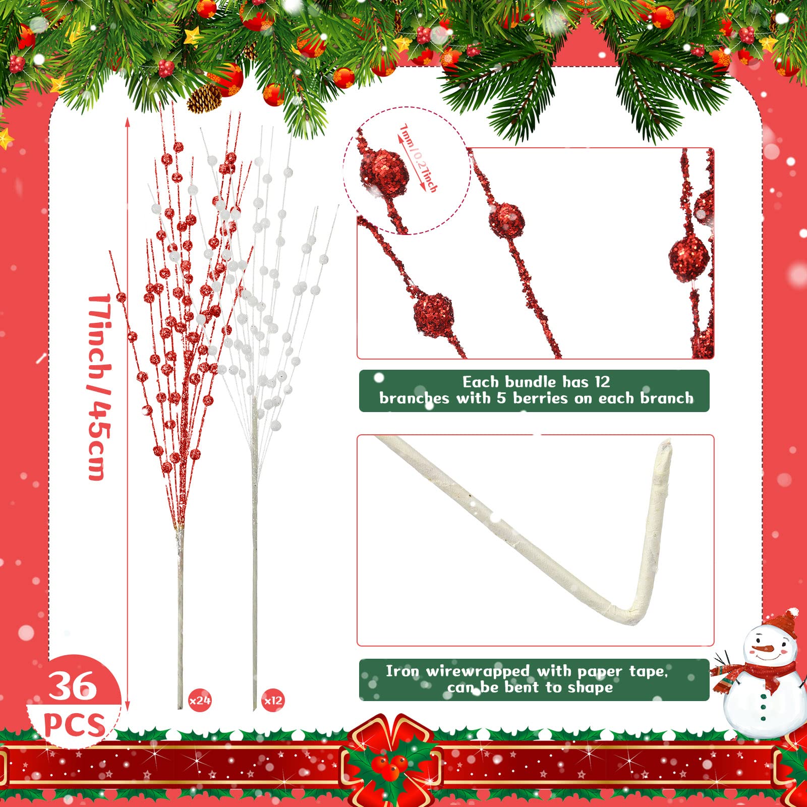 Yilloog 36 Pcs Christmas Artificial Glitter Berry Tree Picks Decorative Bead Sticks for Vase Decor Glitter Berry Stems Branches for Xmas Tree DIY Crafts Holiday Wedding Party, 17 Inch(Red, White)
