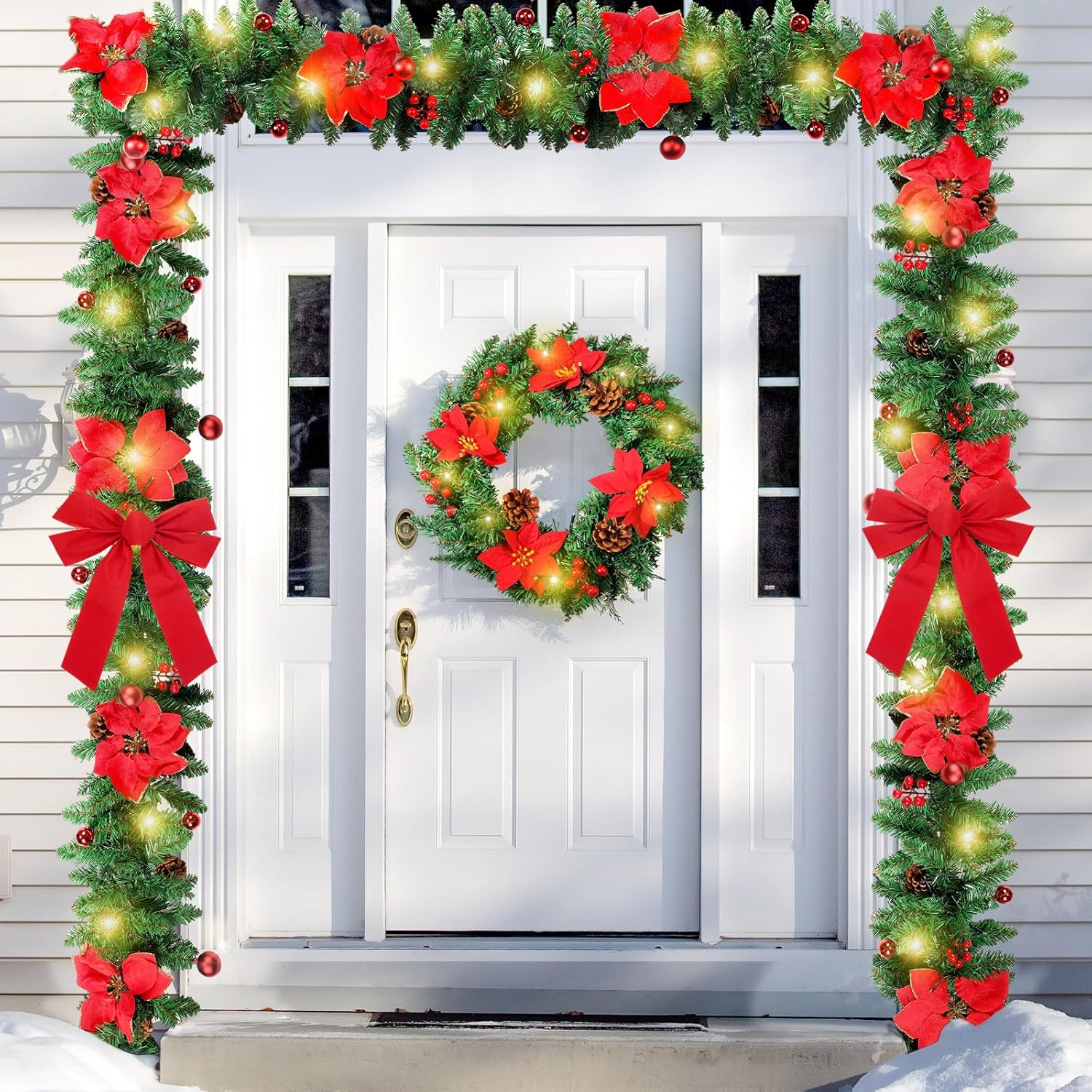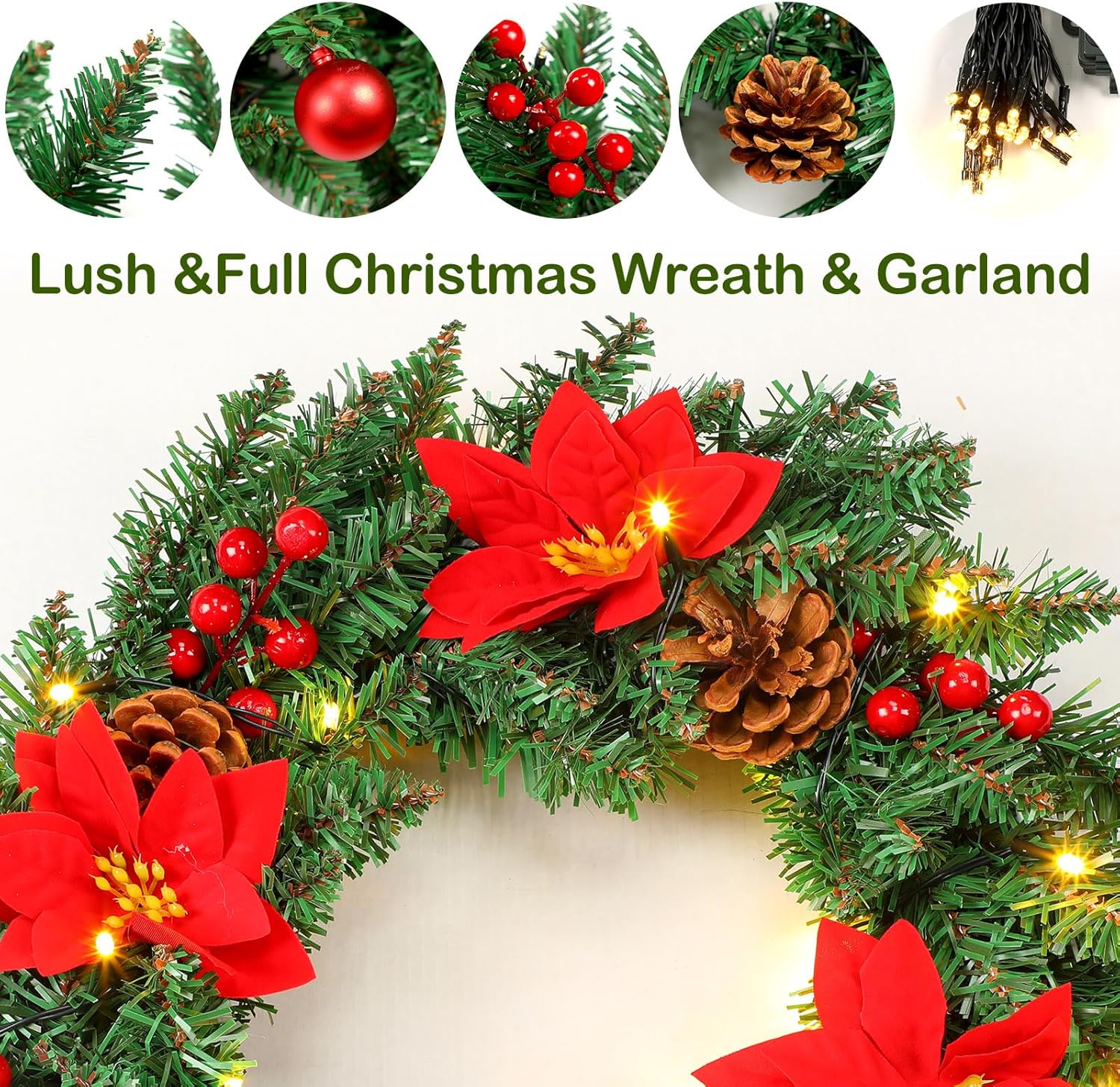 • Charming LED Lights: paired with warm yellow LED lights, the Christmas wreaths can look more charming at night, you can hang it on doors, windows, fireplaces, stairs, walls, or anywhere you like to fill your home with joyous holiday ambient, bring a charming and festive glow to light up your house
