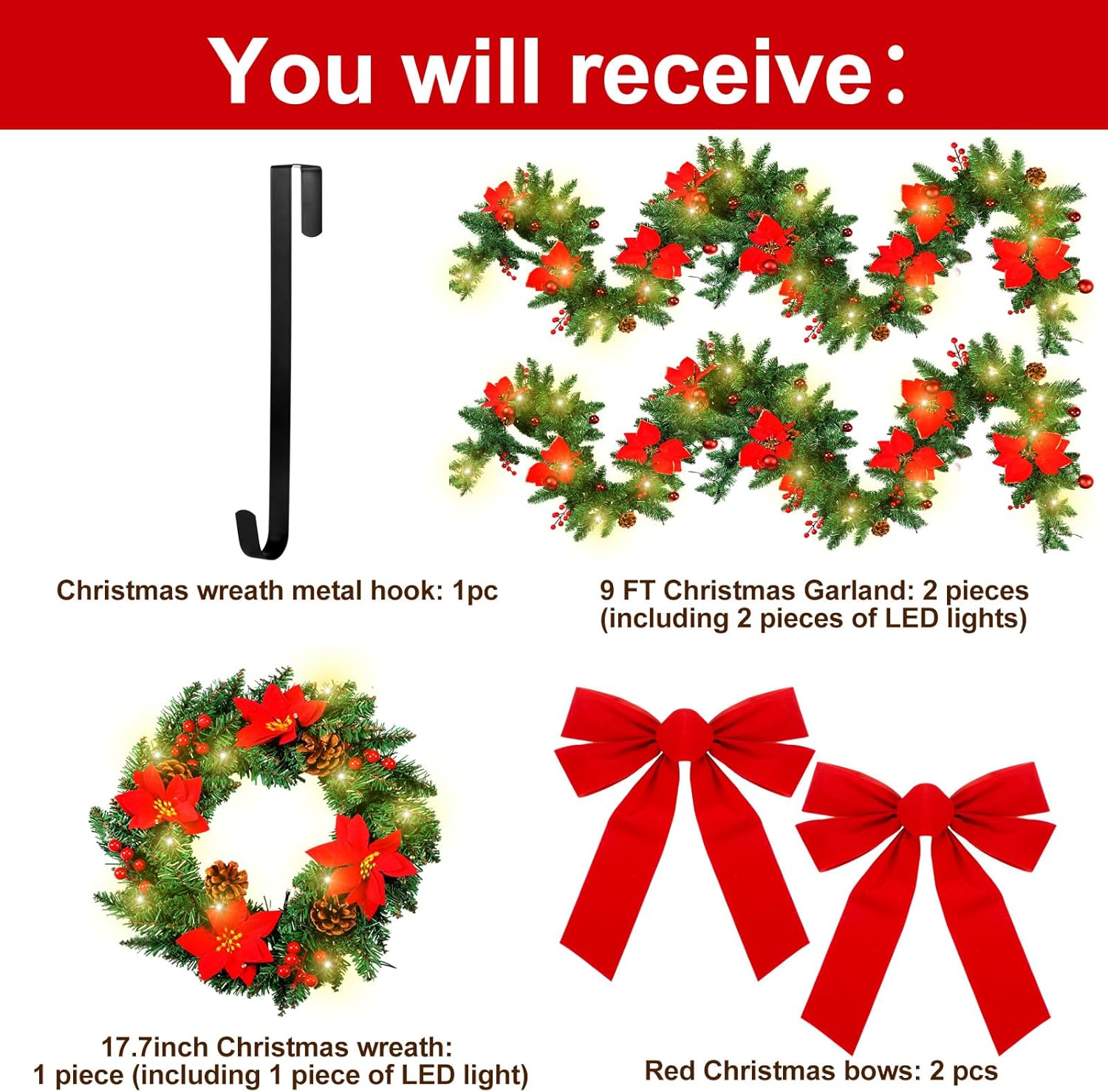 Christmas Wreaths Decoration: you will get 1 pcs lighted Christmas wreath with pine cones red berries, 2 pcs Christmas garland with lights, 2 pcs red Christmas bows, and 1 pcs metal hanger, nice in combination will bring an animate and enjoyable ambiance to your home, look gorgeous indoor or outdoor covered porchRealistic and Exquisite: our Christmas door wreath is made of PE synthetic fir and PVC material, providing you with incredibly realistic spruce branch tips, also adorned with Xmas red bow, pine cones, and red berries, look lifelike and elegant, creating a lively feel to your Christmas decor