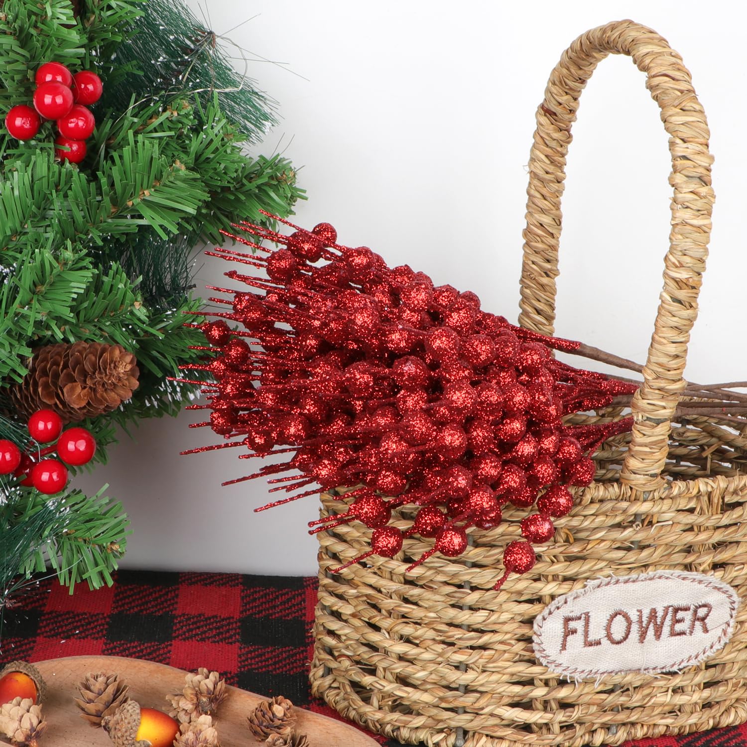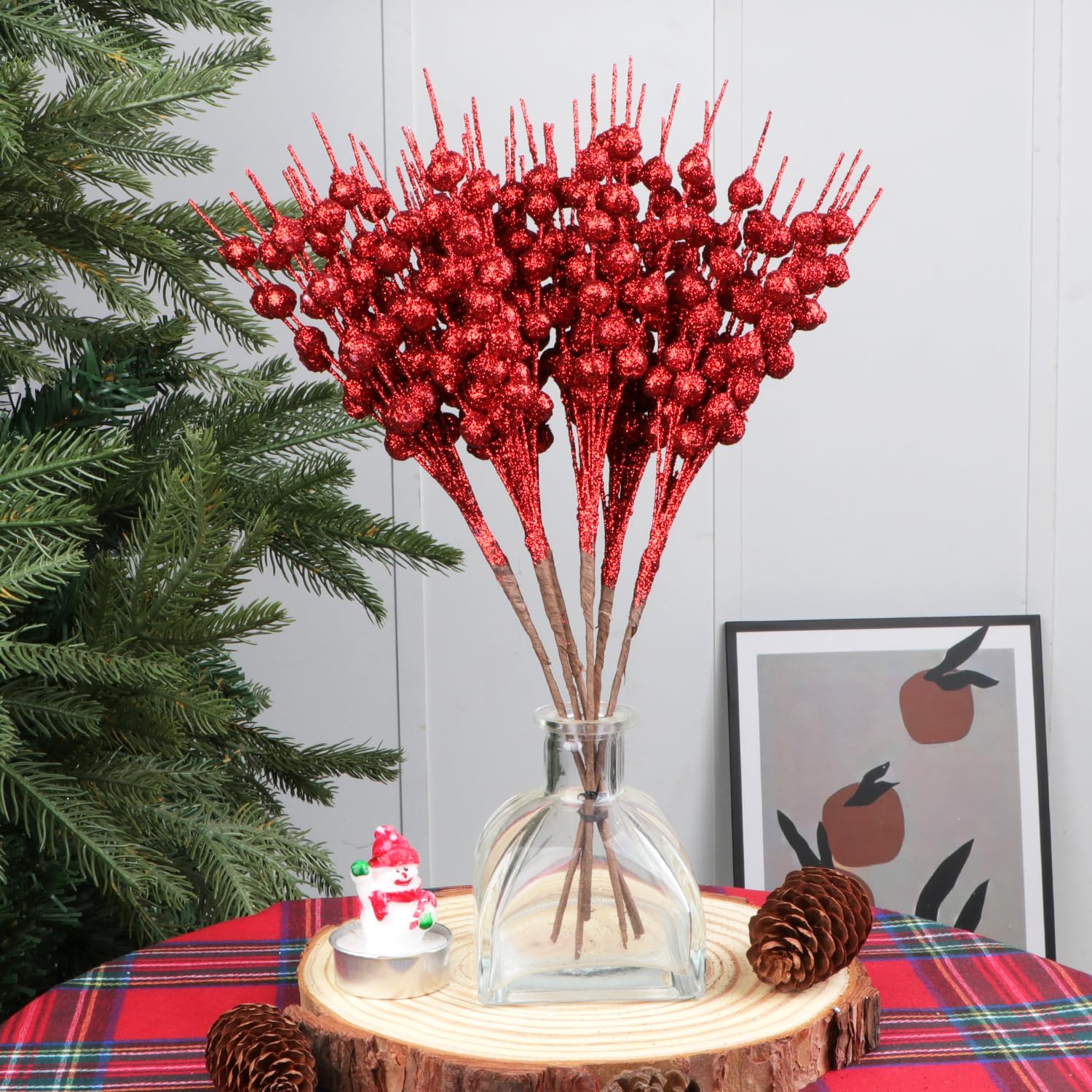 YIYA 6 Pack Red Artificial Glitter Berry Stems Fake Christmas Picks Decorative Plastic Berries for Christmas Tree Decor DIY Crafts Decoration Holiday Home Decor(11")
