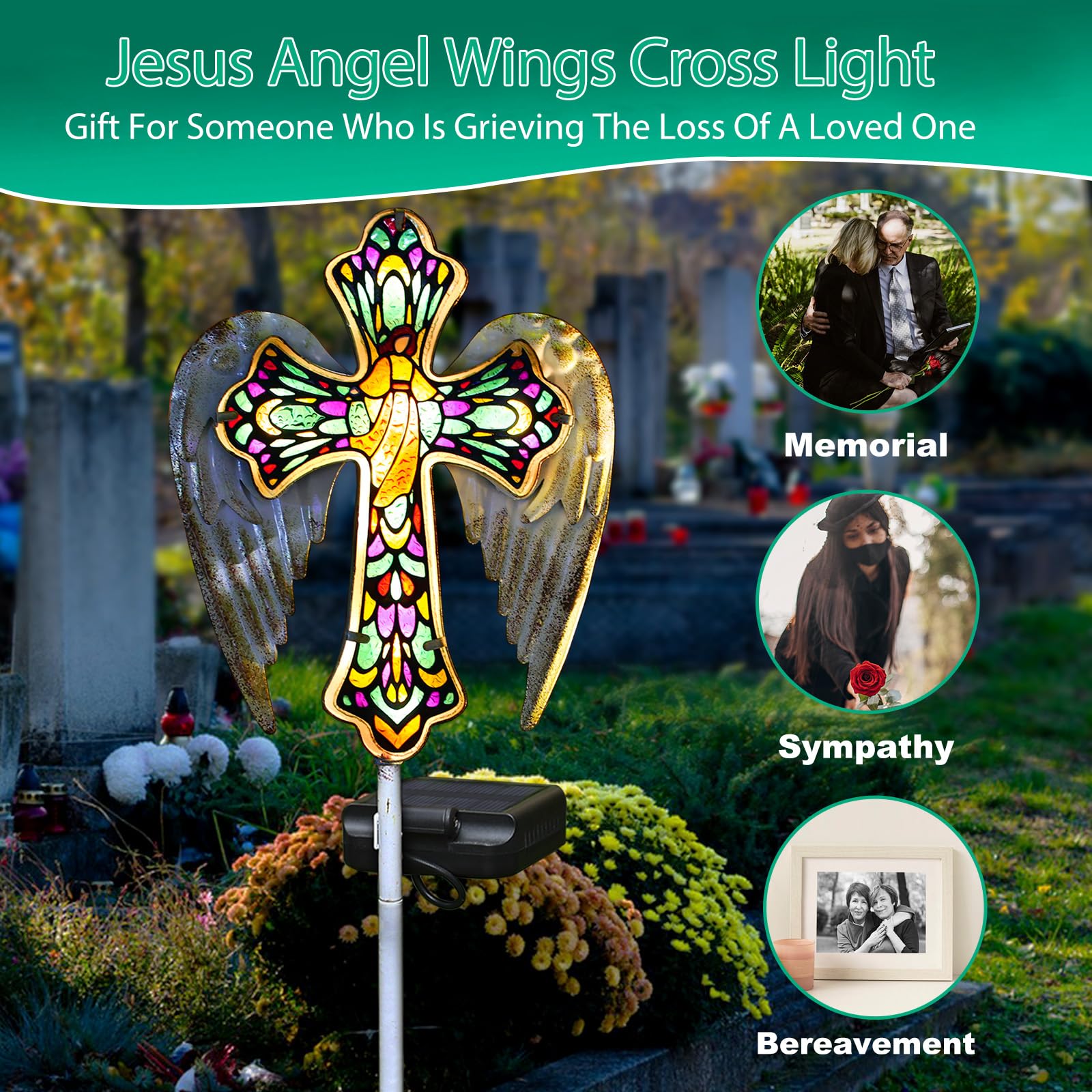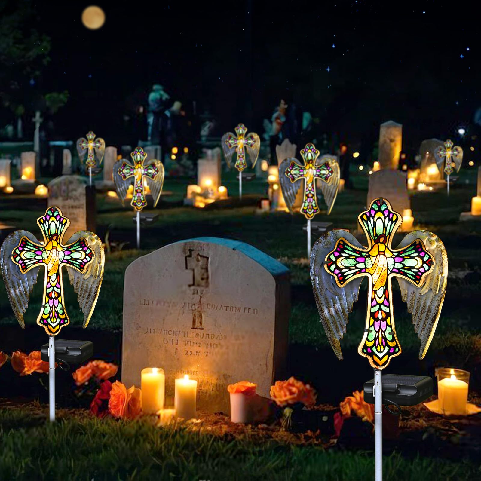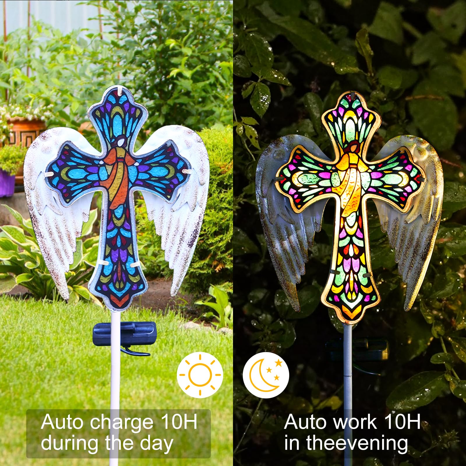 YJFWAL Solar Glass Cross Garden Stake Light, Cemetery Decorations for Grave Outdoor Lights, Jesus Cross Angel Wings Sympathy Memorial s, for Halloween Christmas Garden Lawn Yard Patio Decor