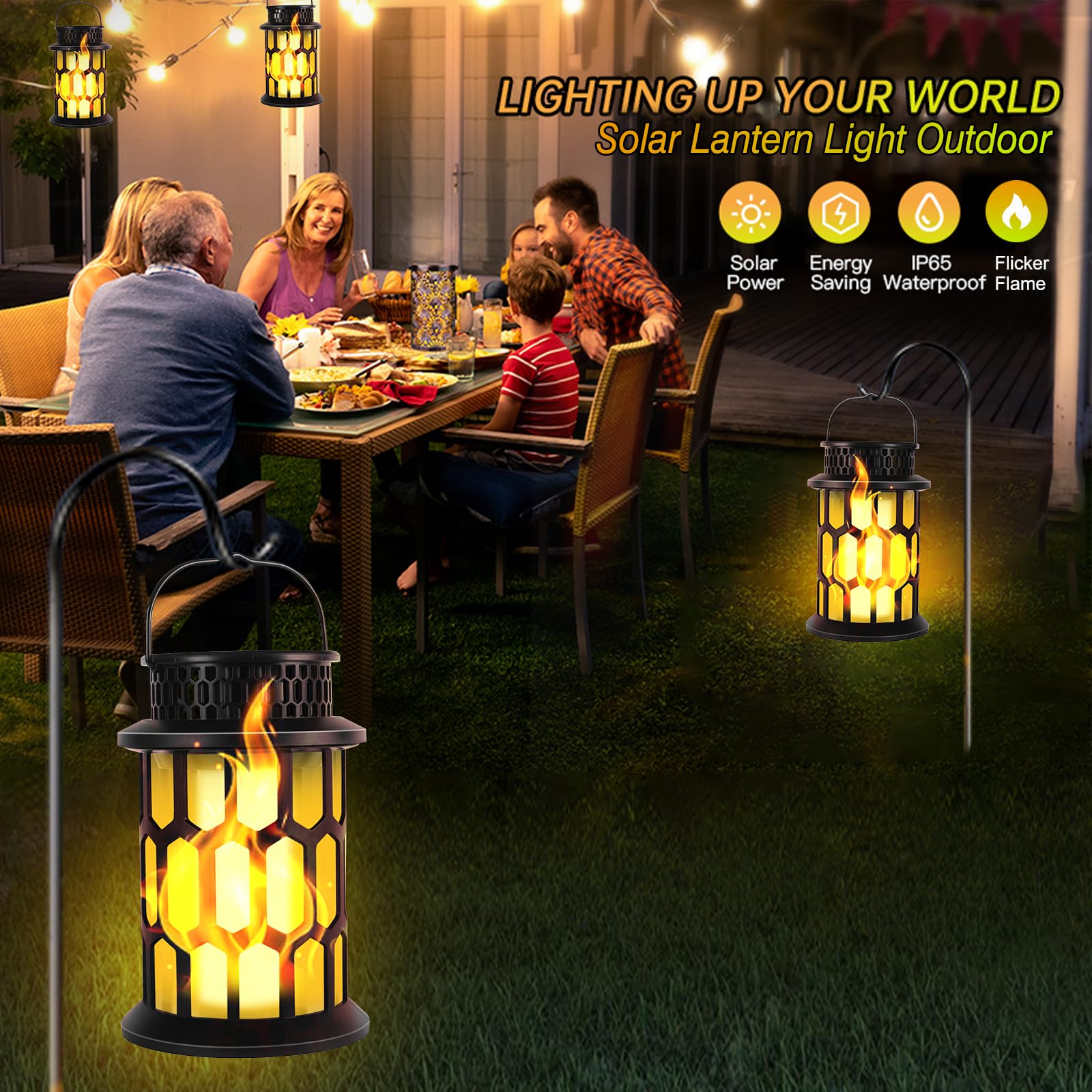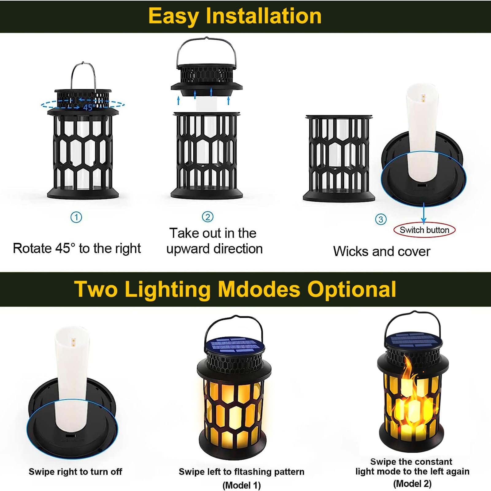 【Dual Lighting Modes】These outdoor solar lantern 2 lighting options: a dynamic flickering flame that imitates natural fire and a steady warm light mode for a soothing ambiance. Whether you want an energetic flame or a calm glow, both modes enhance the atmosphere of any setting 【Vivid Dancing Flames】These outdoor solar lanterns combine modern and classic design, mimicking the appearance of real candle flames with a dynamic dancing effect. The waterproof construction adds an elegant and lively touch, creating a stunning glow at night. Featuring d LED beads, they emit a warm, romantic ambiance, making them ideal for decorating your yard, garden, and perfect for Halloween or Christmas festivities