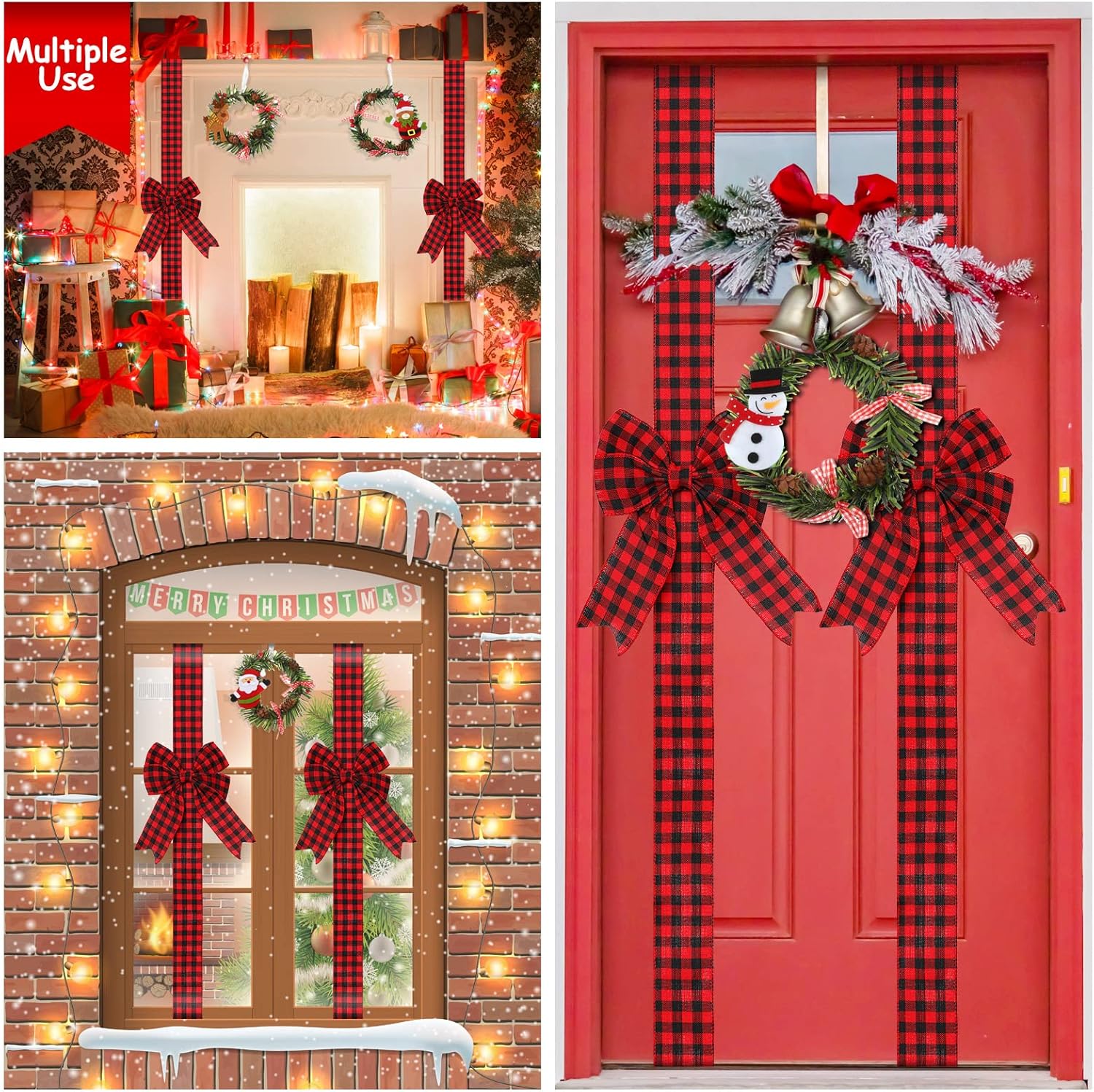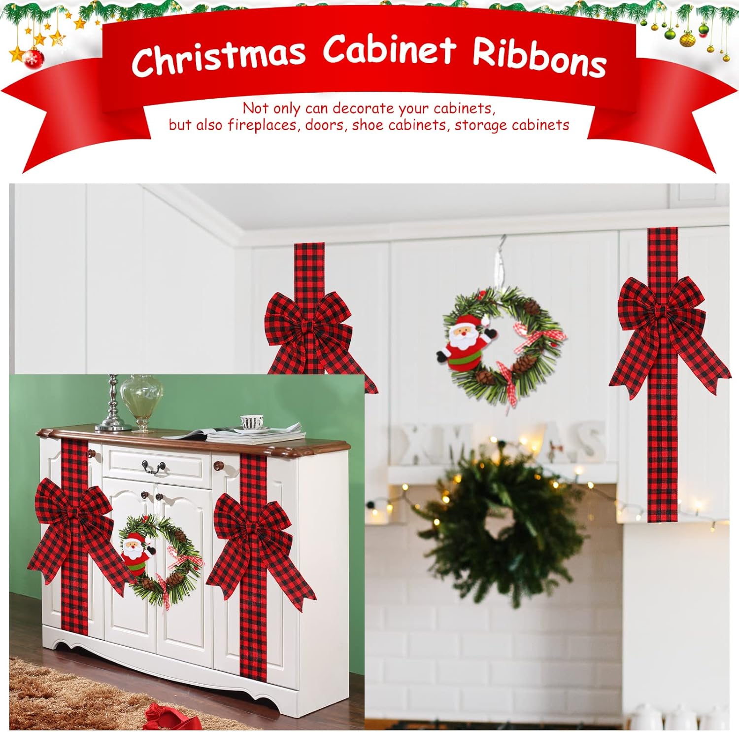 Ysleen 6 Pcs Christmas Cabinet Ribbon Bows Festive Large Xmas Bows and 4 Pcs Christmas Pine Wreath with Snowman Santa Claus Artificial Christmas Front Door Wreath for Christmas Party (Black and Red)