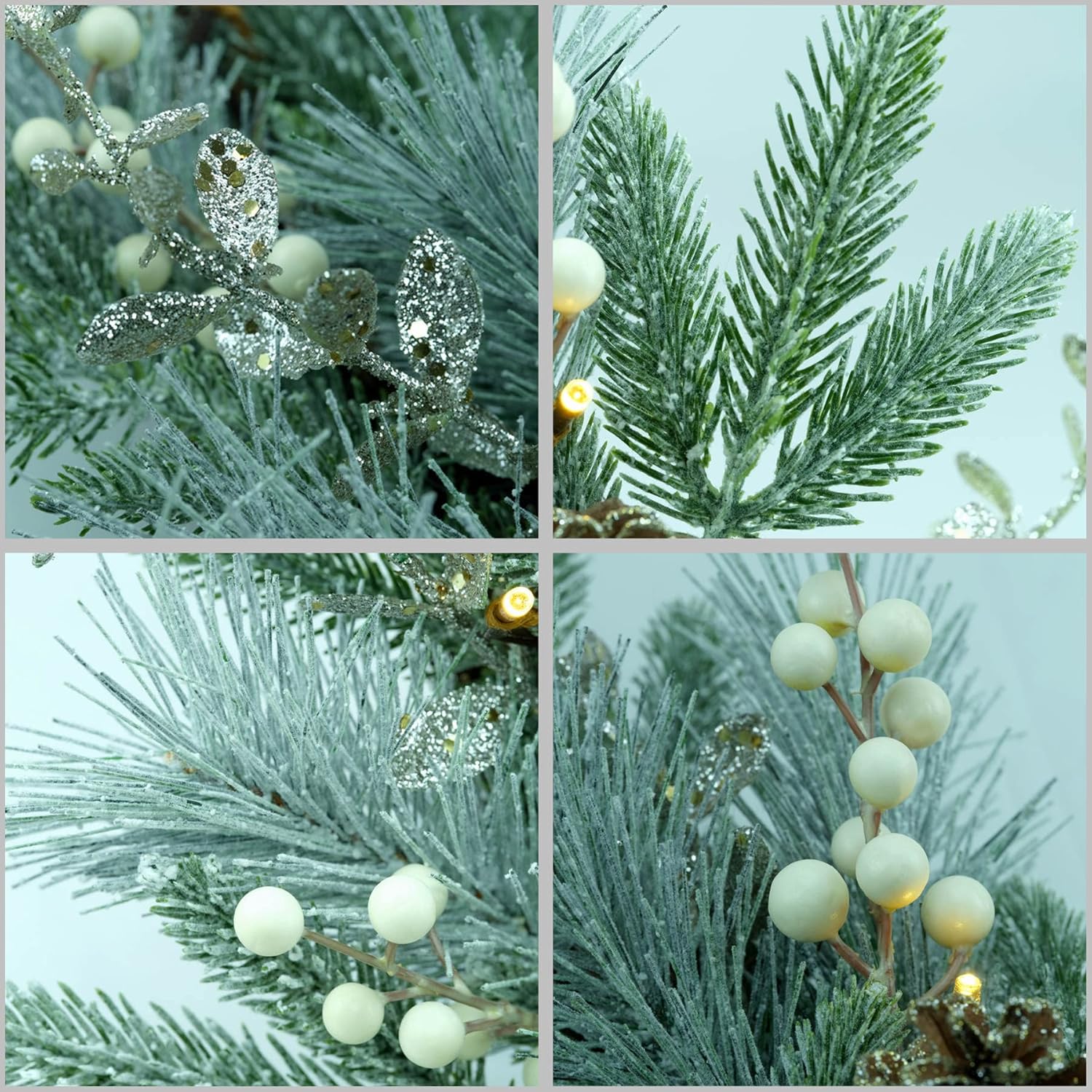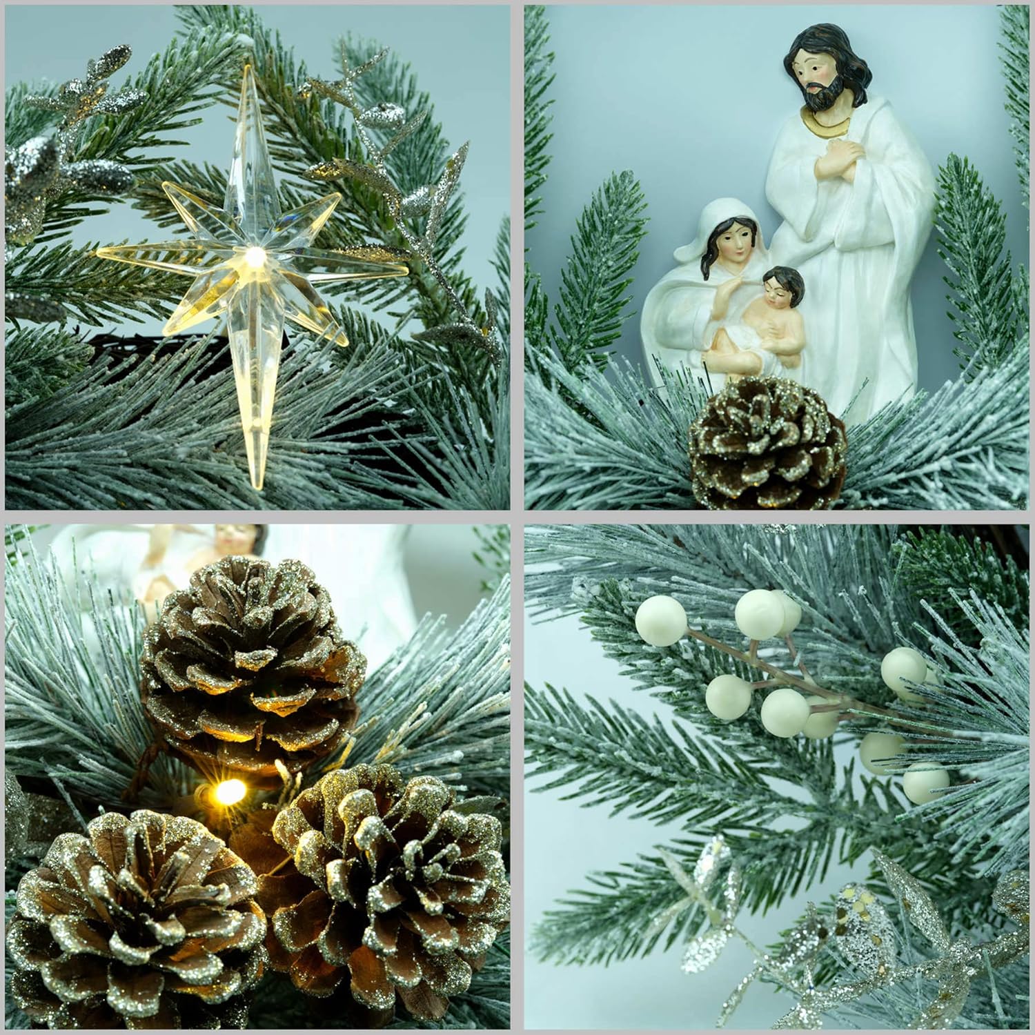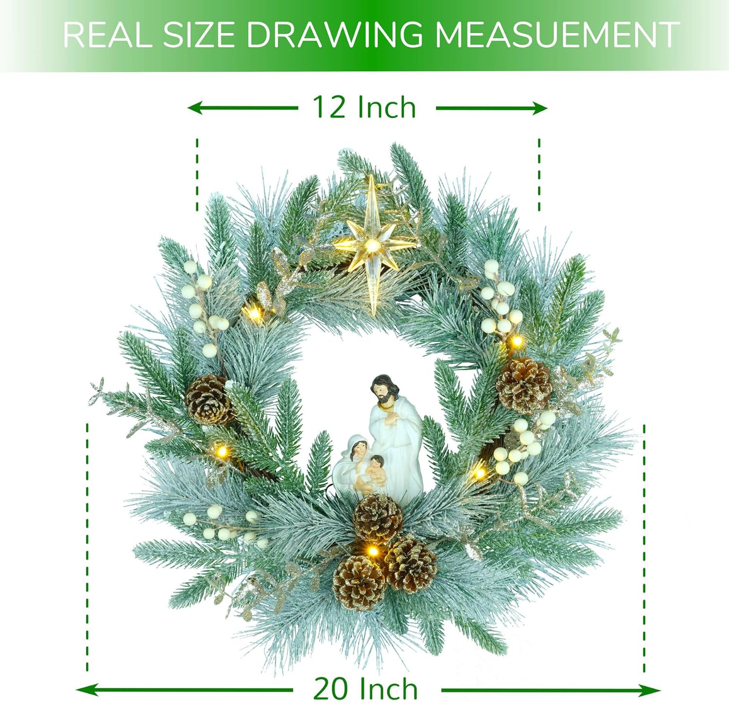 YULETIME 20" Pre-Lit Nativity Wreath, Battery Operated with 10 Fairy Lights, Holy Family Nativity Statue, Star of Bethlehem, Pine Cones, White Mistletoe, Frosted Spruce Branches (Nativity Frosted)
