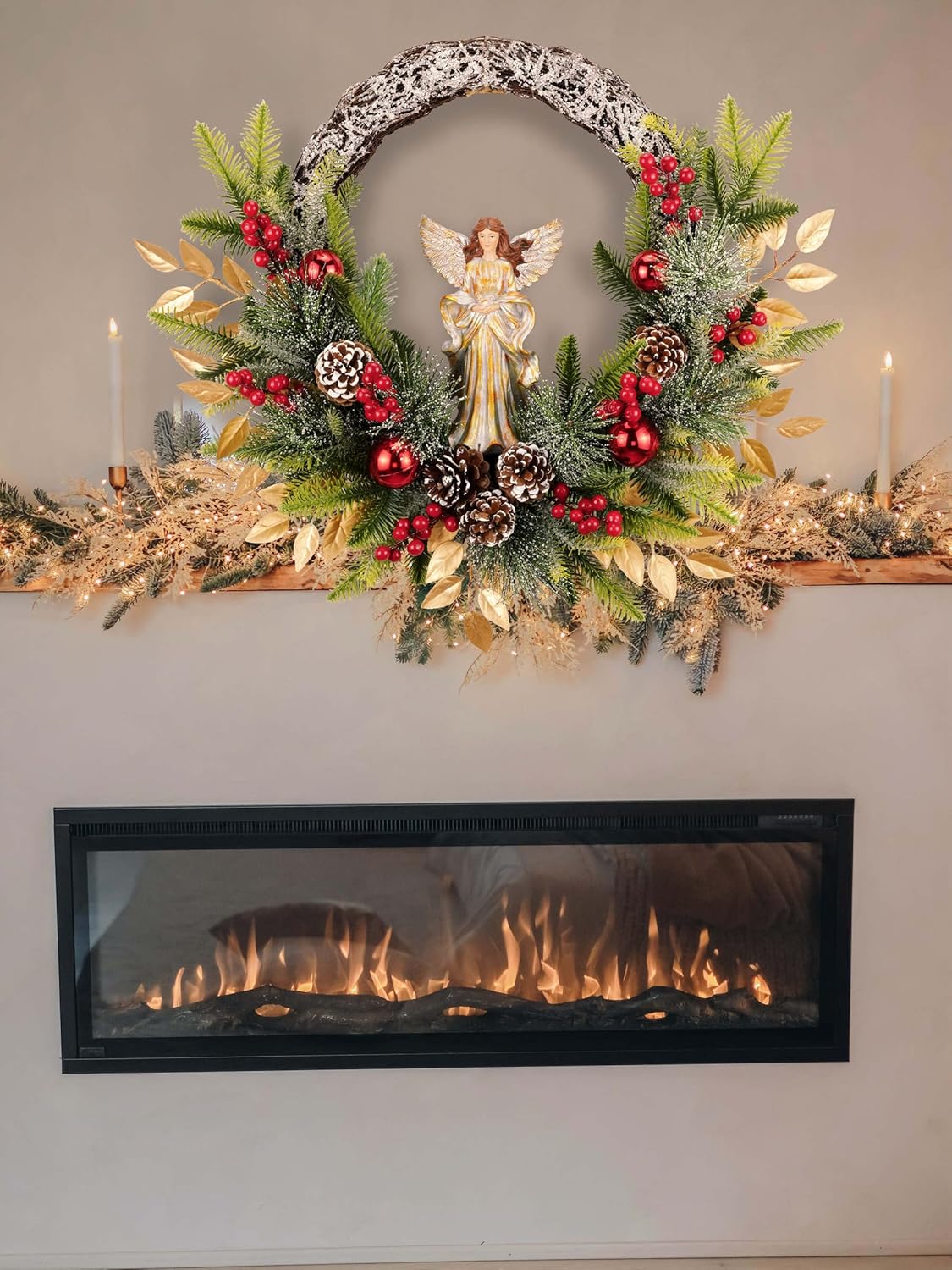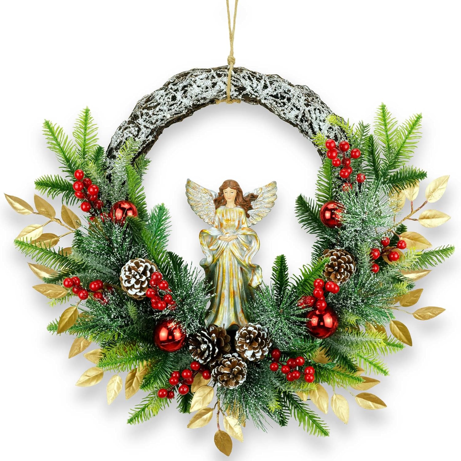 YULETIME 24" Angel Christmas Wreath, Artificial Holiday Wreath with Resin Angel Statue, Natural Rattan Ring & Pine Cones, Golden Leaves, Red Baubles, Spruce Branches, Snowy Pine Needles (Angel)