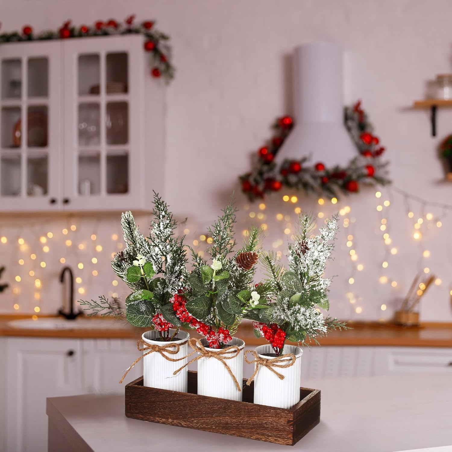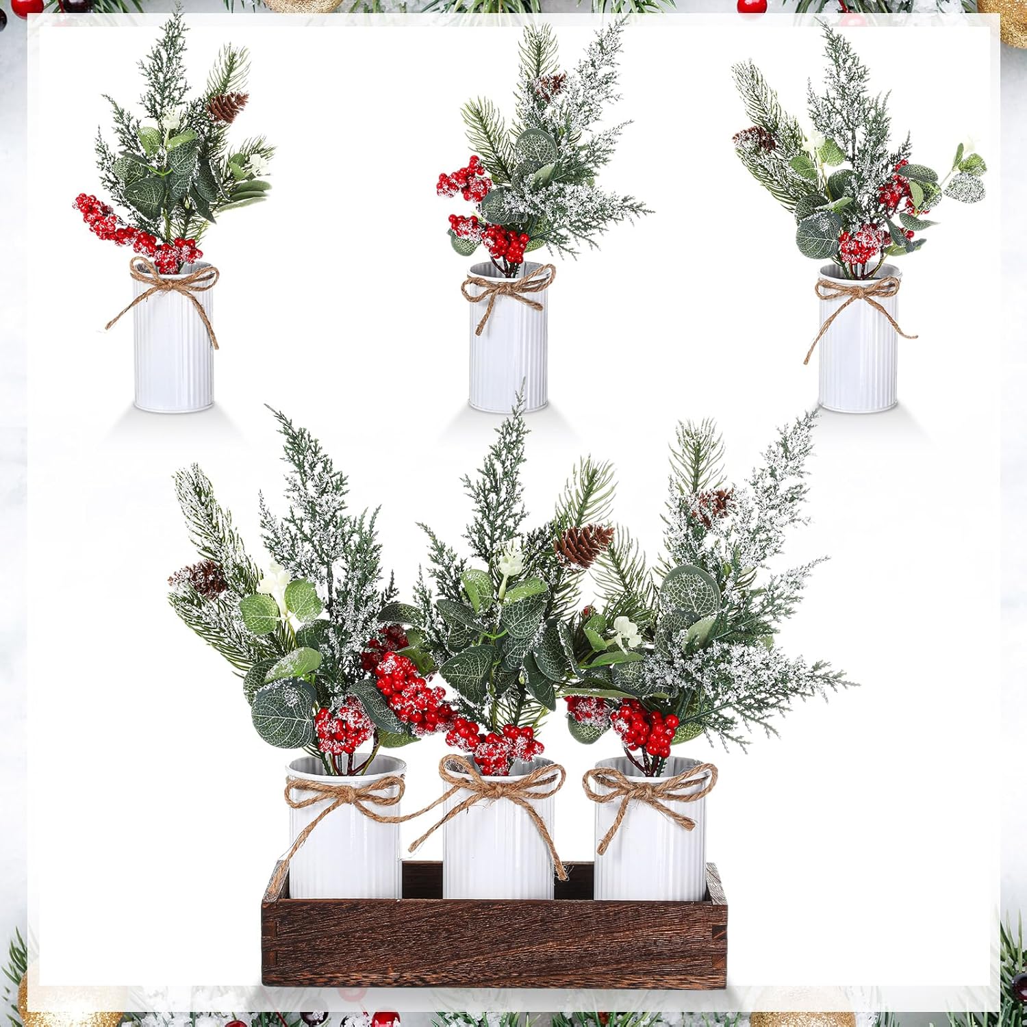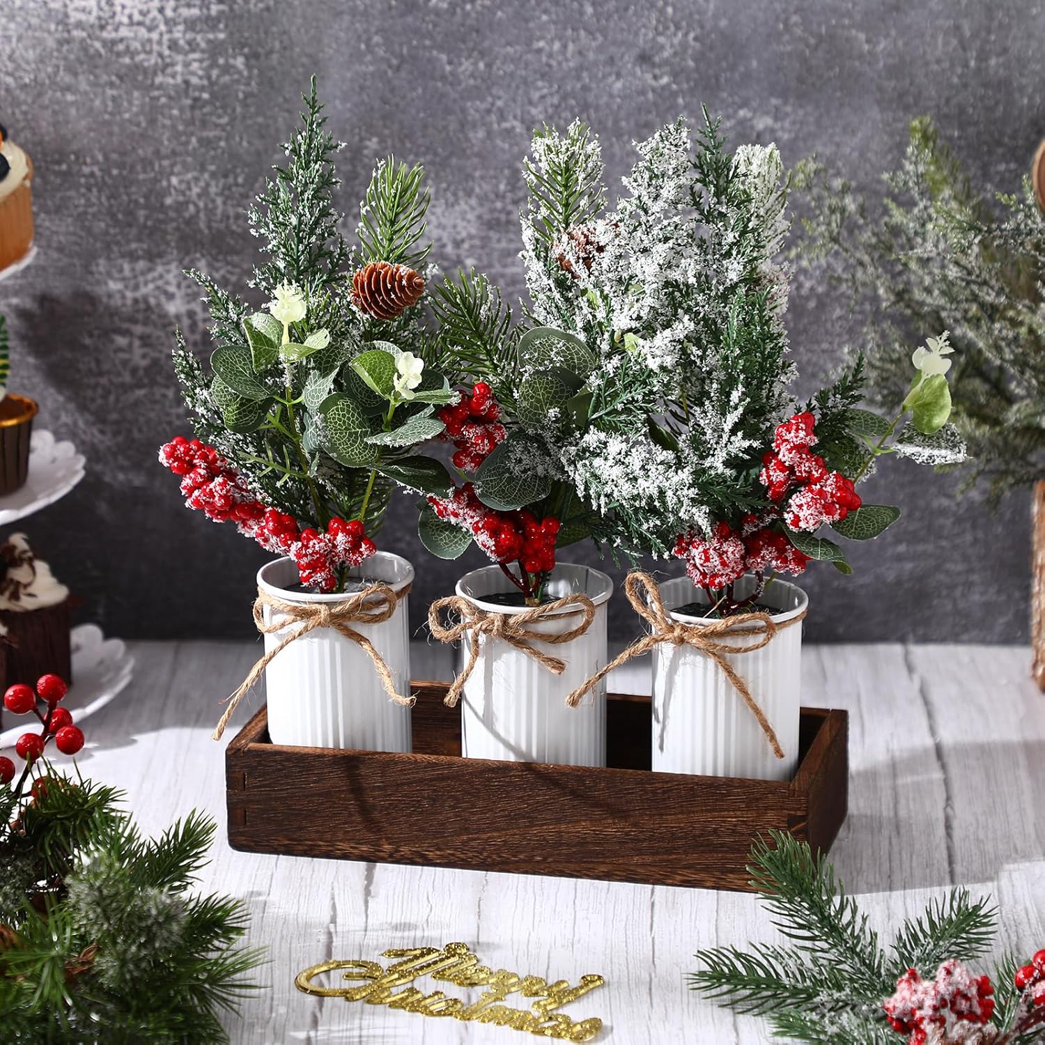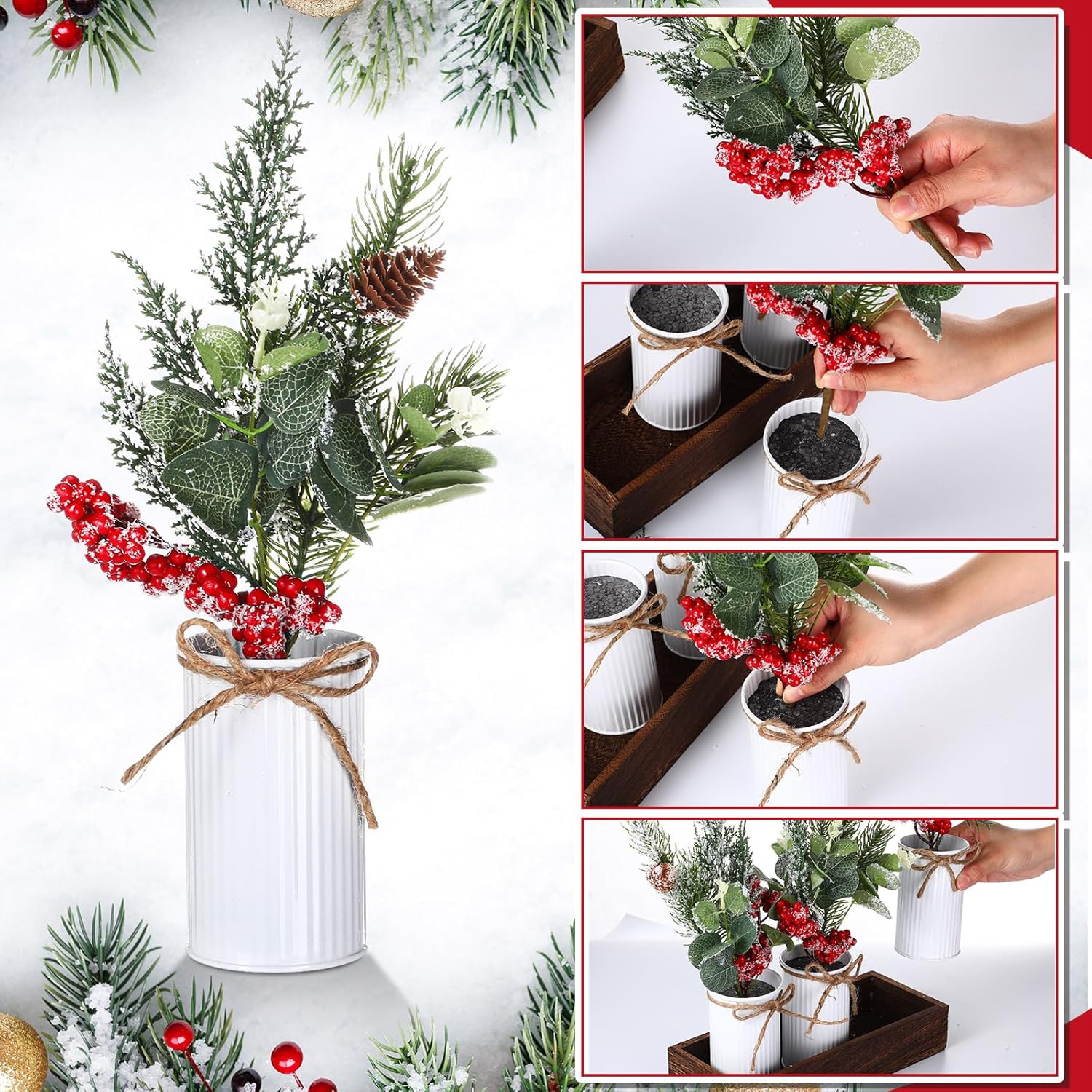Christmas Potted Plants: there is 1 rustic rectangular wood tray, 3 white vintage galvanized metal pots with 6 assorted artificial Christmas floral arrangements, including 2 branches of Eucalyptus, 1 berry, 1 pine needle, 1 pine and cypress leaves, and 1 pine cone in each pot, ideal as farmhouse table centerpiecesFarmhouse Rustic Design: the galvanized metal pots are tied with twine bow, the rustic rectangular wood box set is ideal and enough to meet your farmhouse Christmas table centerpieces demands Each basin has foam to satisfy your casual DIY