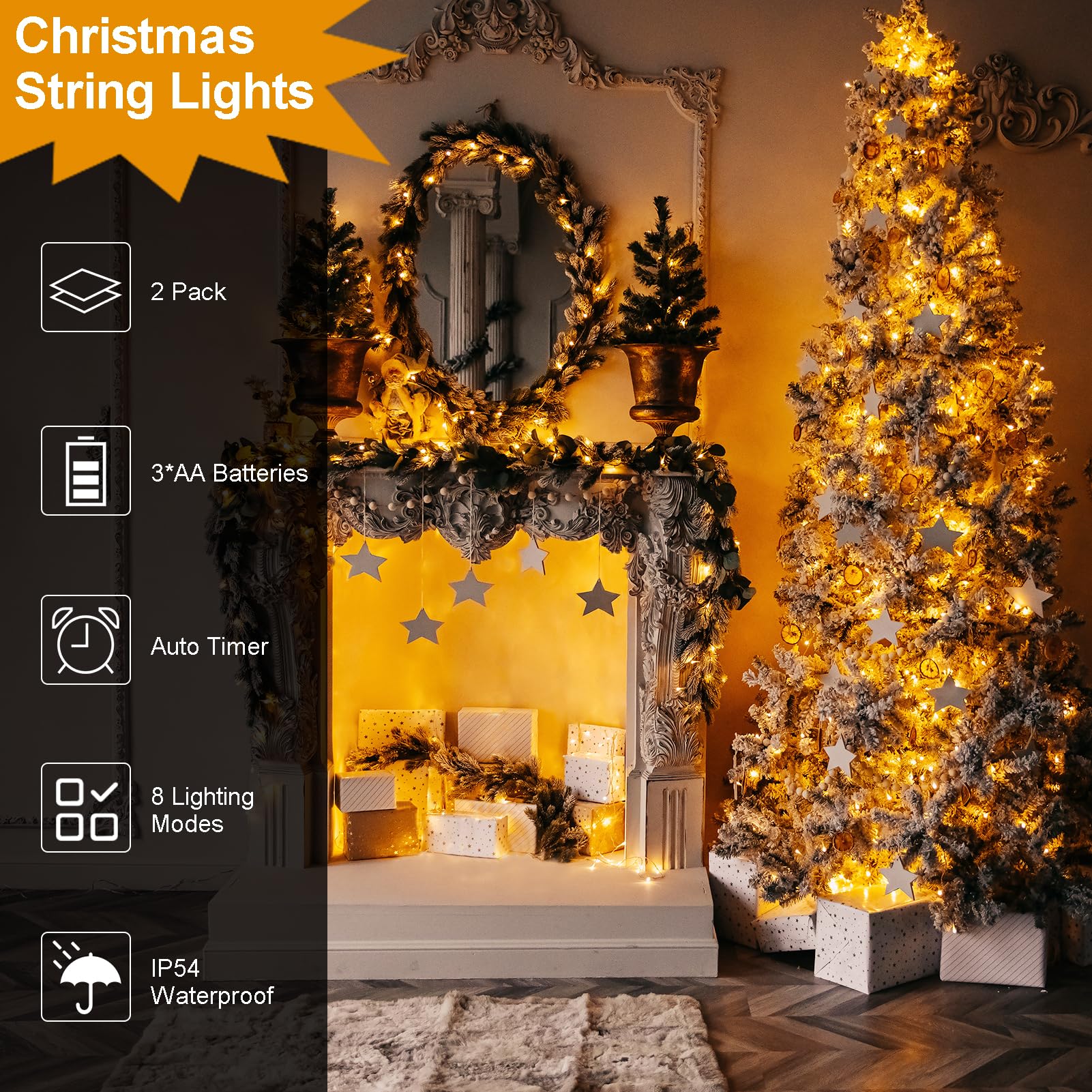 ZAIYW 2 Pack Christmas Lights 23ft 70 LED, Battery Operated Mini String Lights Waterproof Christmas Tree Lights with Timer for Indoor Outdoor Home Party Garden Yard Xmas Decoration, Warm White