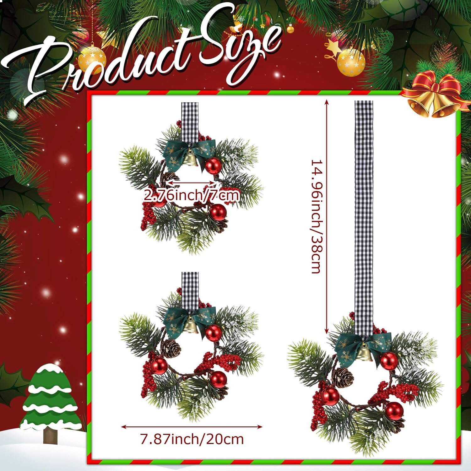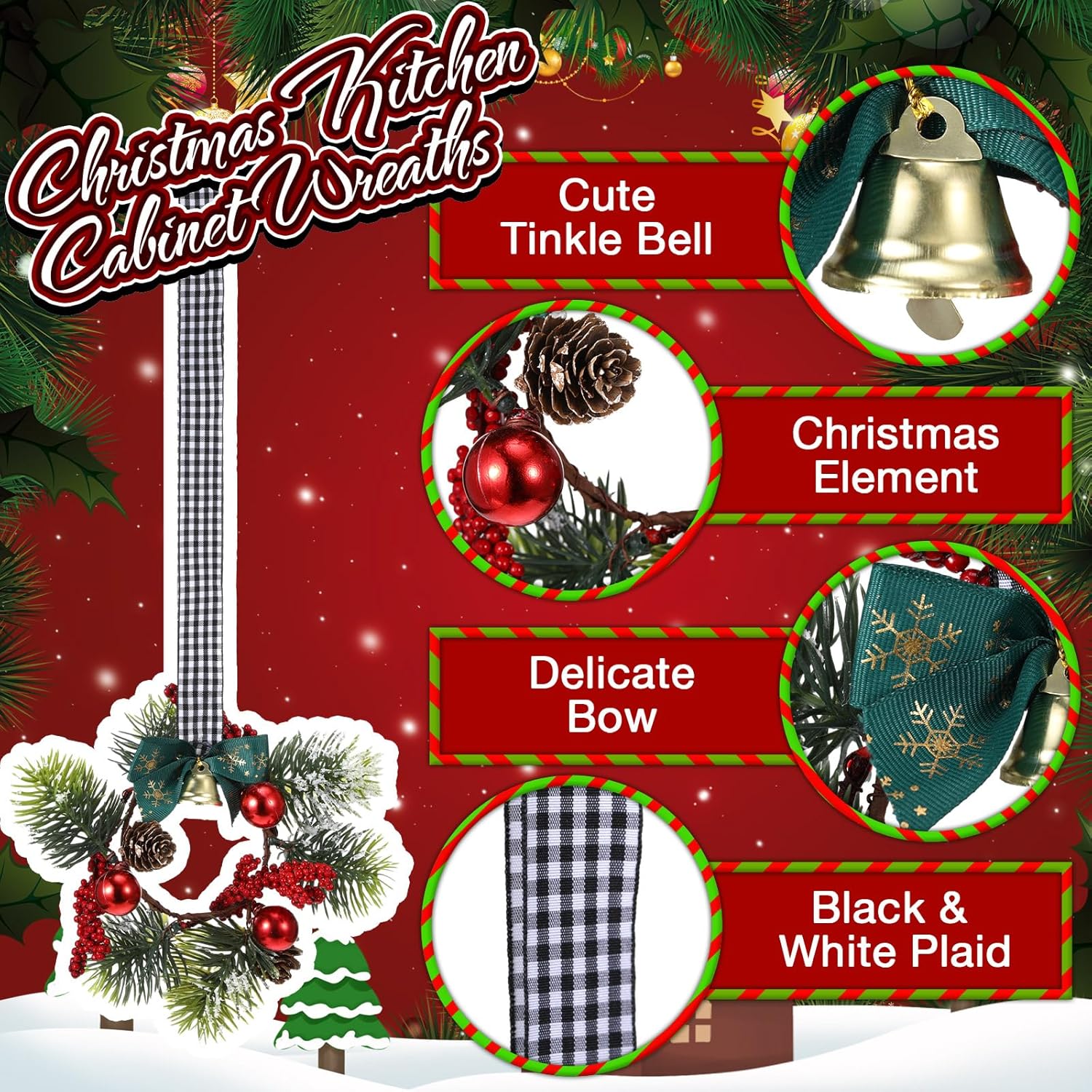 Zeyune 12 Pcs Christmas Kitchen Cabinet Wreaths with Plaid Bow Ribbon Hanging Cabinet Doors Wreaths Decorative for Kitchen Window Outdoor Indoor Holiday Decor, 14.96 x 7.87'' (Simple Style)