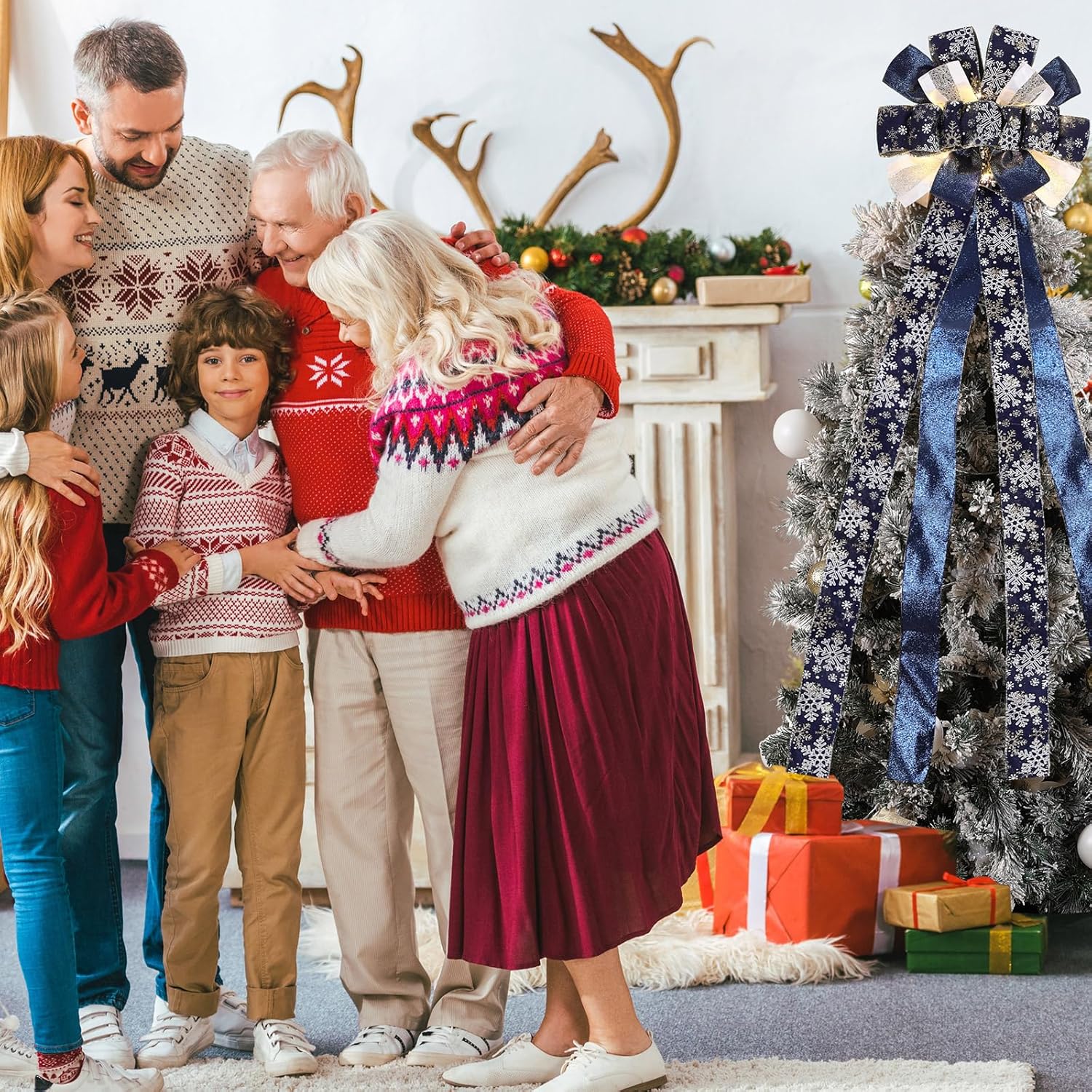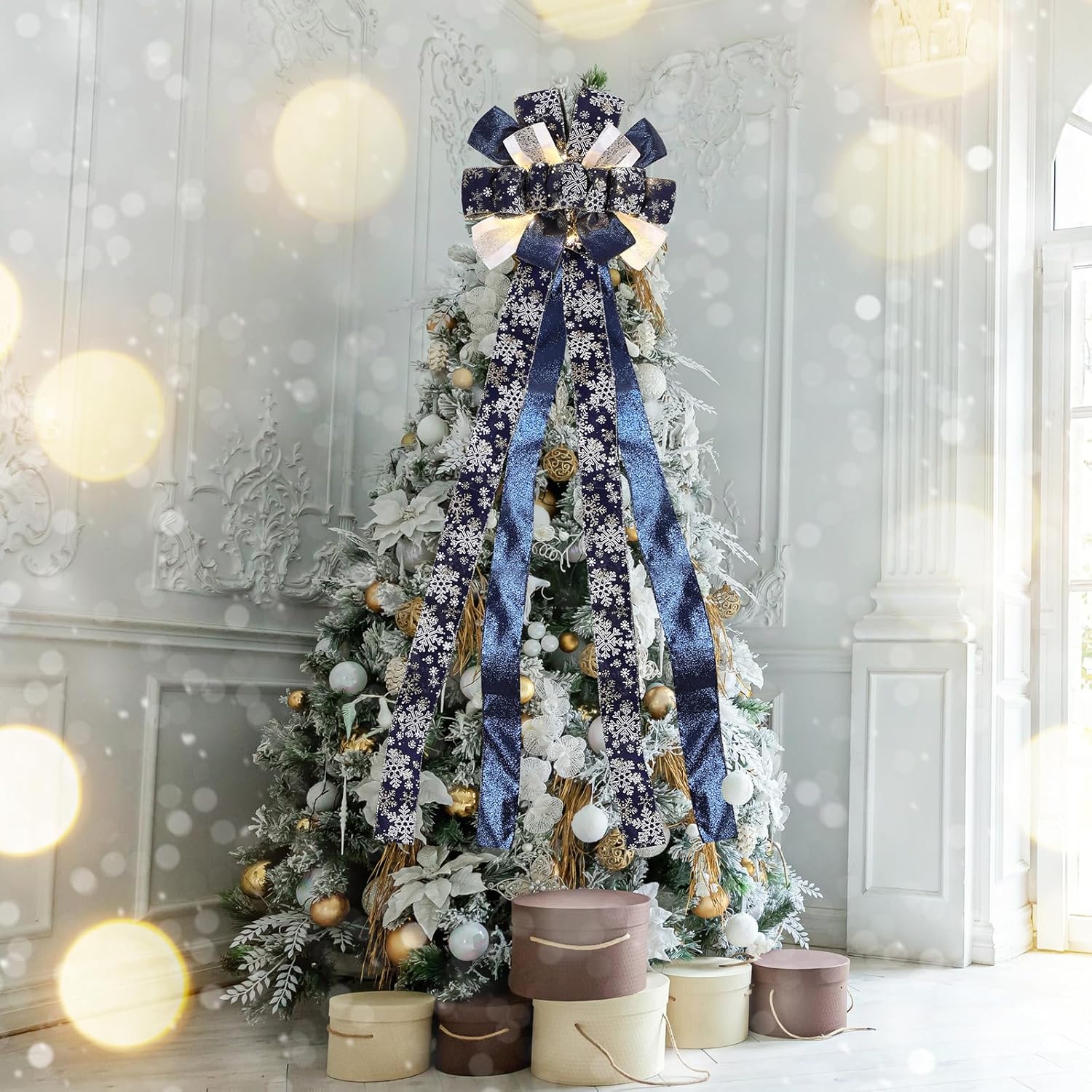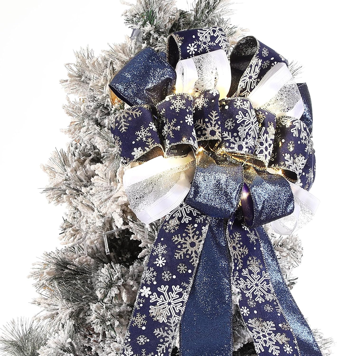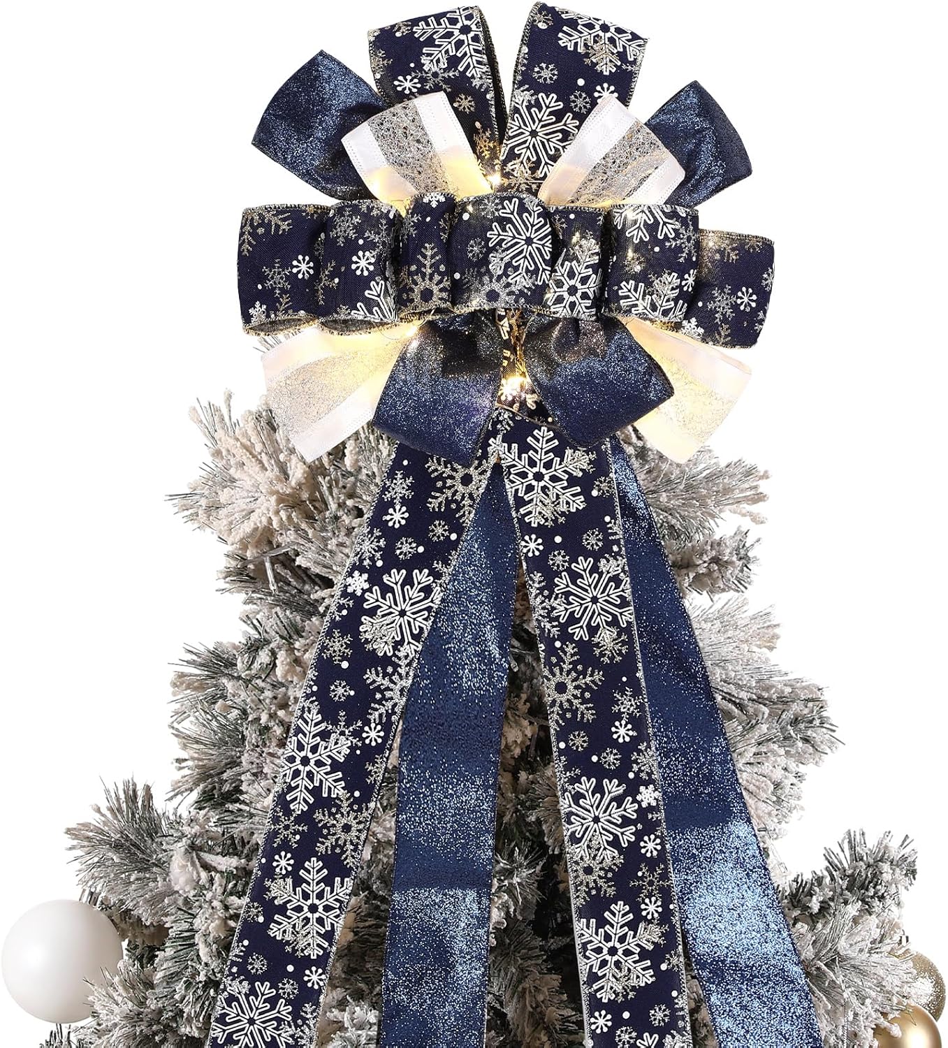 Zeyune Christmas Tree Topper 12 x 45 inches Large Christmas Bows LED Lights Glitter Satin Mesh Streamer Snowflake Ribbon Decorative Bows for Christmas Tree Decorations(Blue)