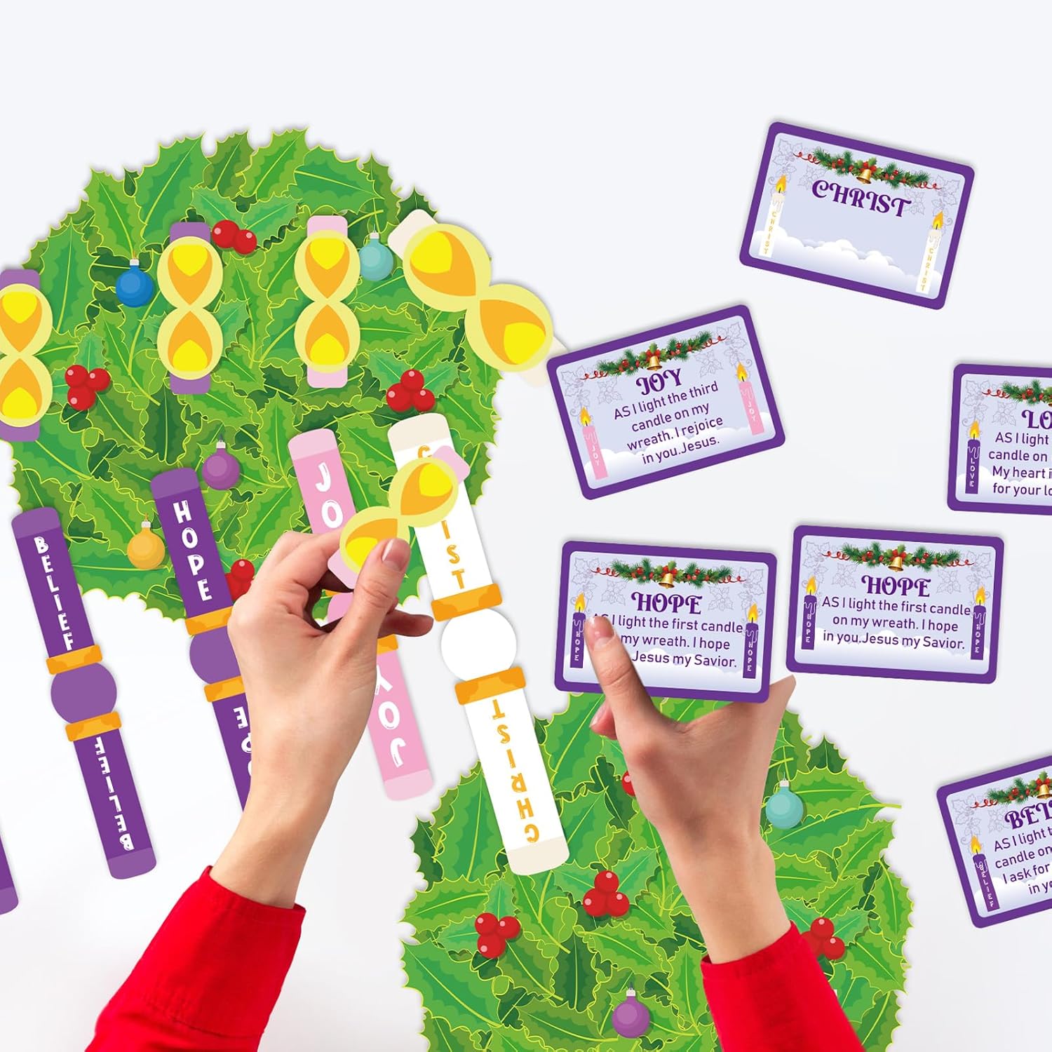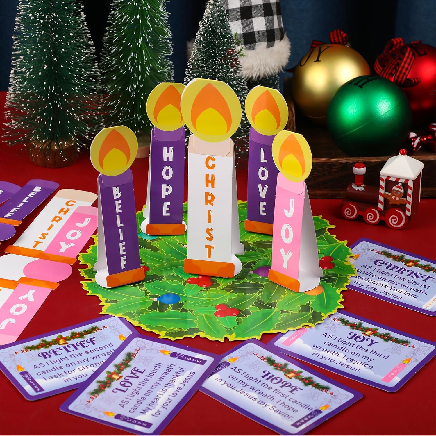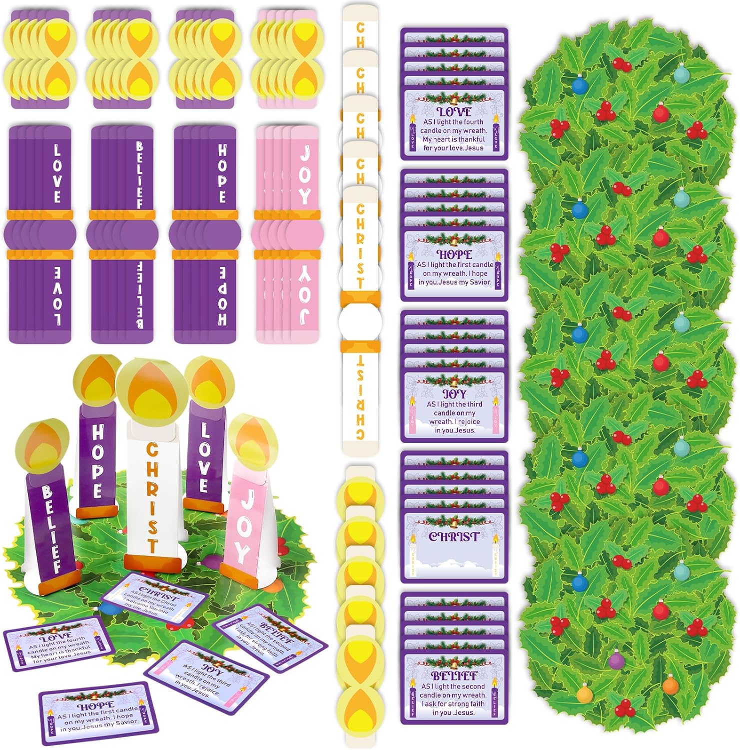 Christmas Advent Calendar Crafts Set: the package comes with 24 sets of advent crafts, each advent DIY craft set contains 1 piece of advent wreath cutout printed berry and ball patterns, 5 pieces of bible saying calendar cards, 5 pieces candles cutouts, 5 pieces flame stickers, and 120 glue point dots There are enough quantity your paper craft needs, ideal for craft activity during ChristmasBeautiful Christmas Advent Design: these advent kits are designed with classical advent wreath elements, comes with 5 candles printed with words [Peace], [Hope], [Christ], [Love] and [Joy], and each card has an explanation Children can DIY in order according to the contents of the cards, making artwork and learning about Christ at the same time