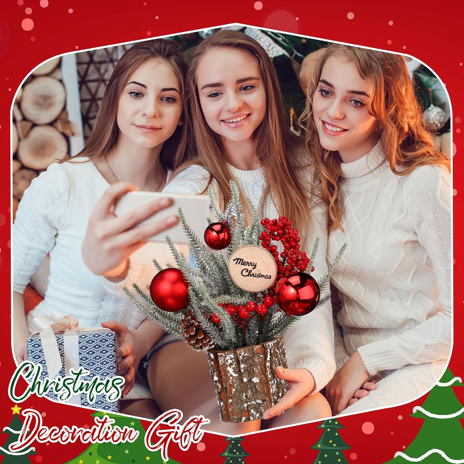 Zhehao 12'' Small Christmas Tree Artificial Mini Tabletop Christmas Tree Decorations with Red Ball Red Berry Pine Cone Greenery Wood Signs Portable Christmas Decor for Party Holiday Fireplace