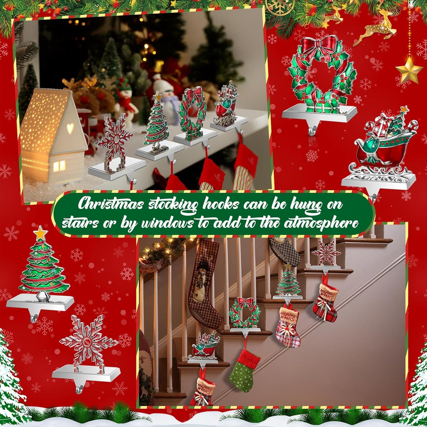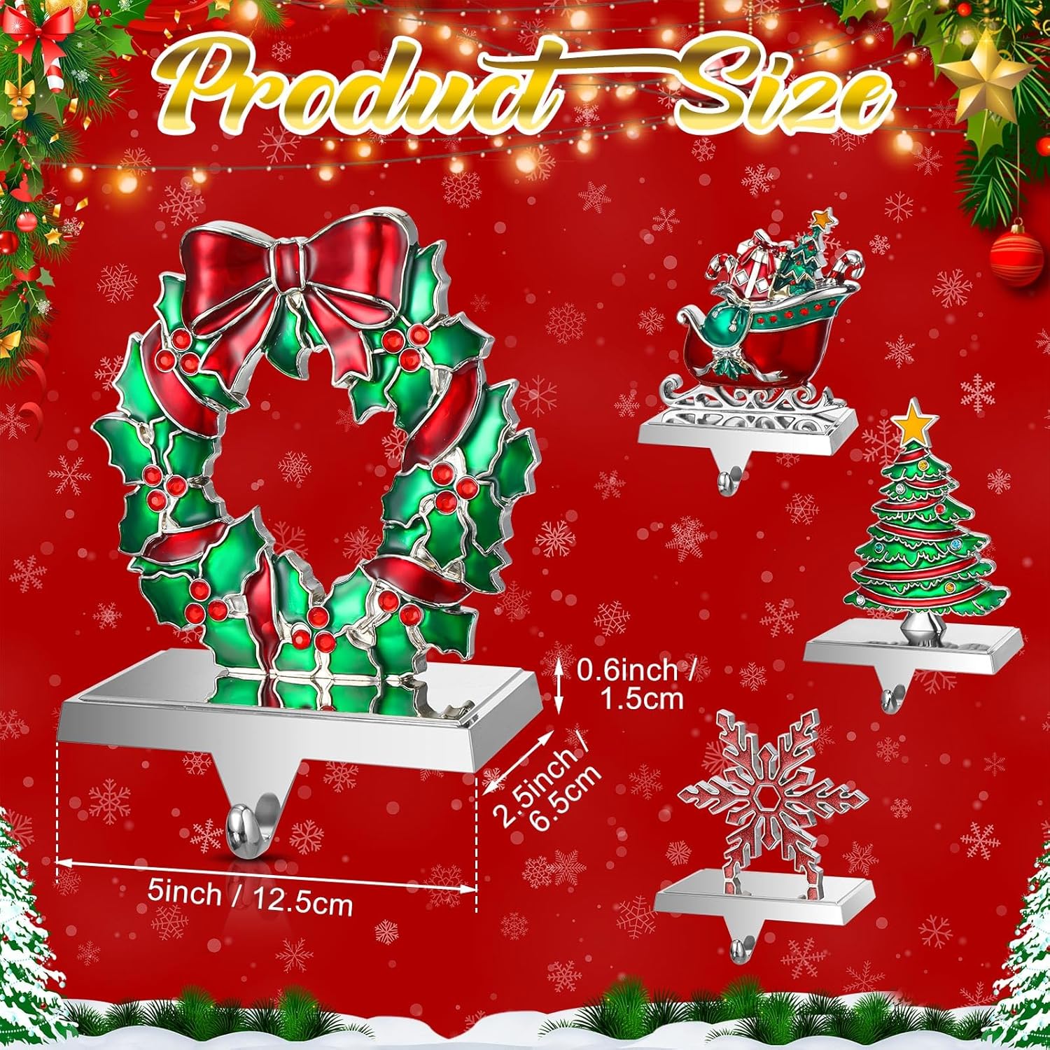 Zhengmy 4 Pcs Christmas Stocking Holders for Mantel Reindeer Snowflake Snowman Pine Xmas Tree Stocking Hangers Metal Stocking Mantel Holders Christmas Decoration for Xmas Fireplace (Wreath)