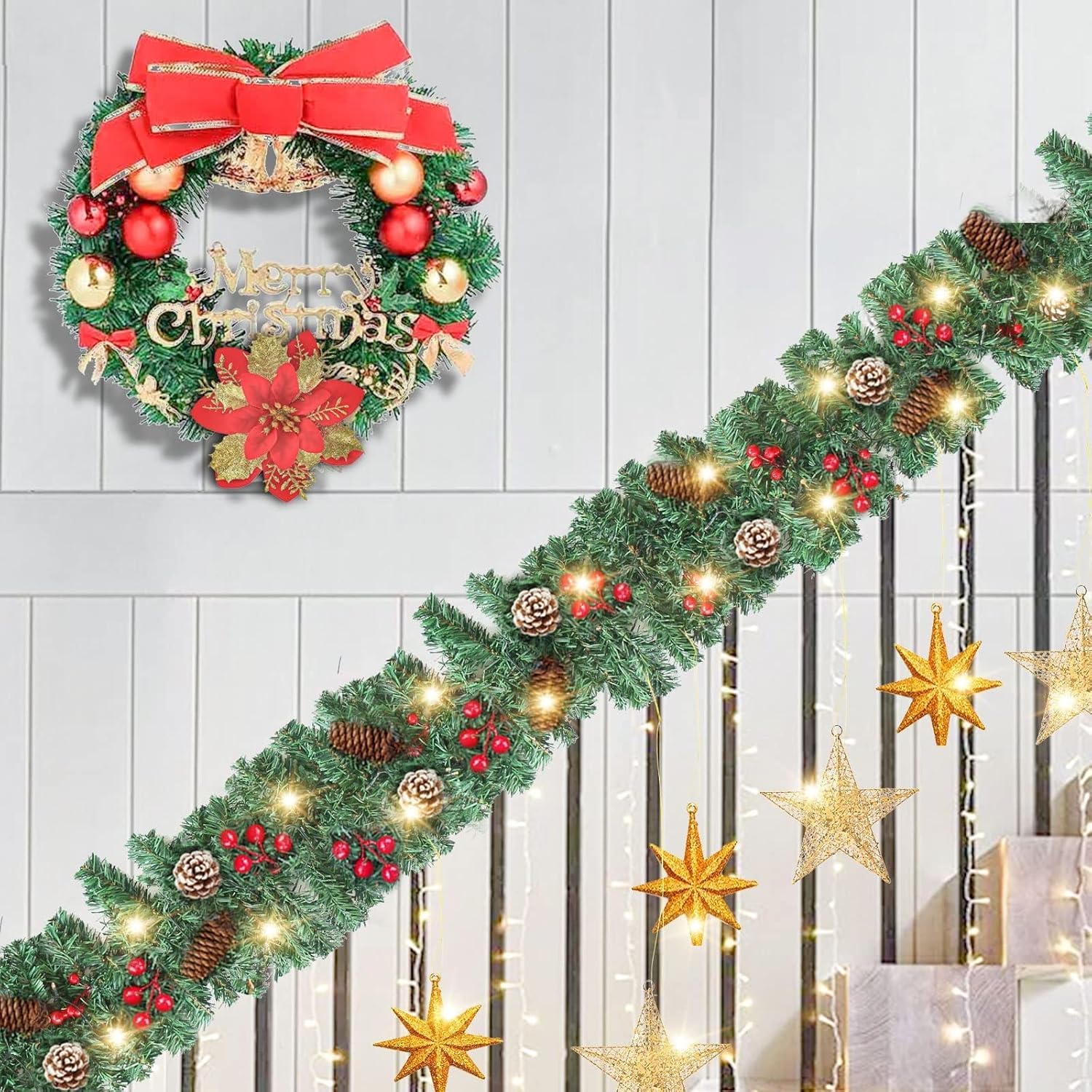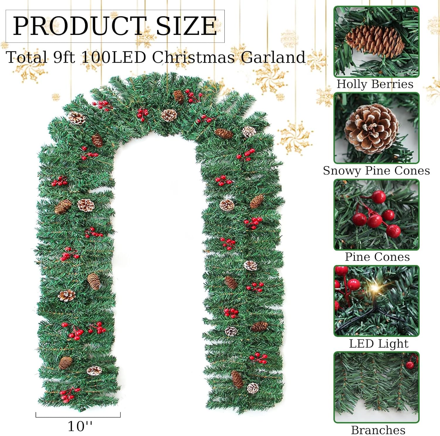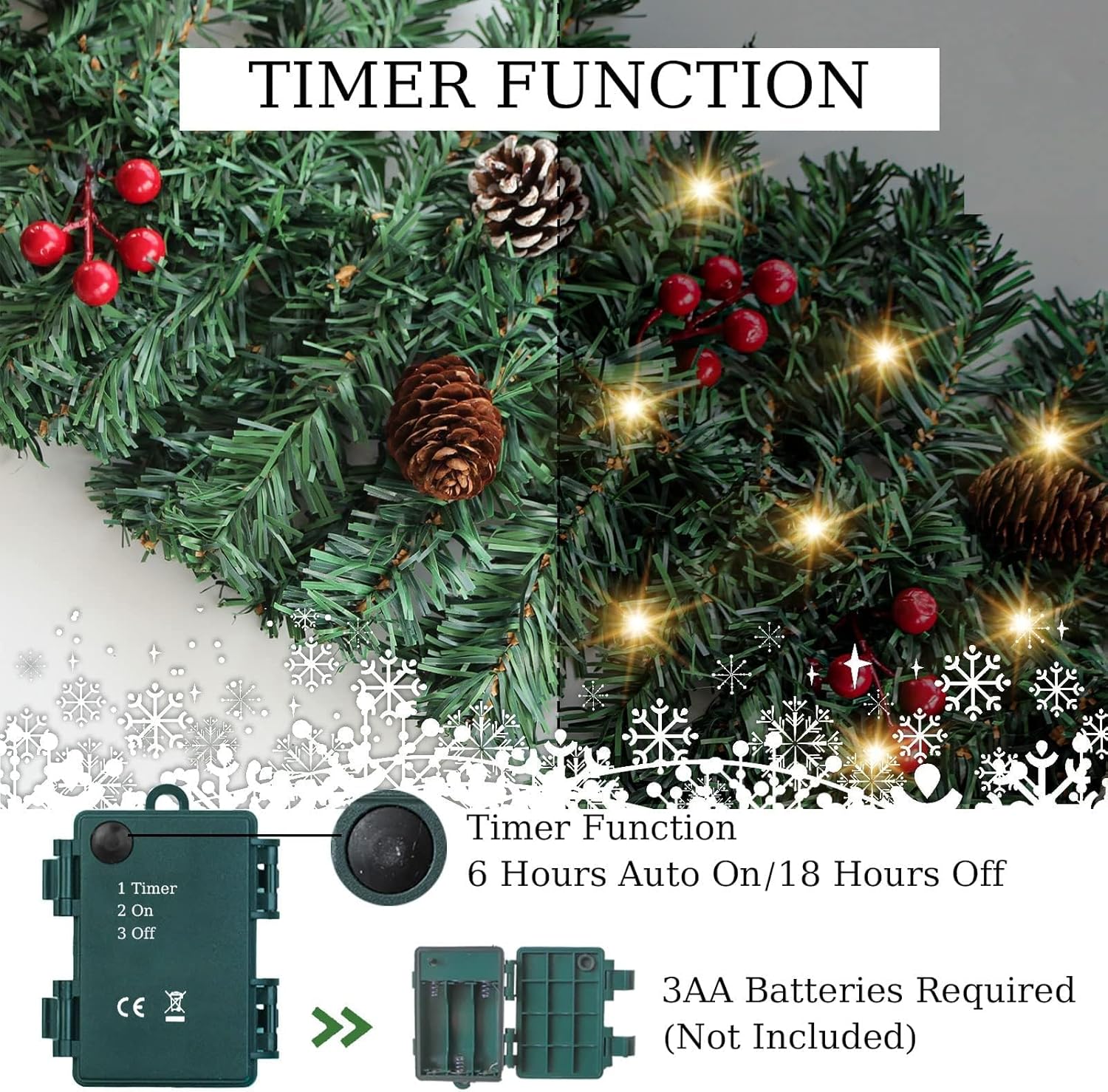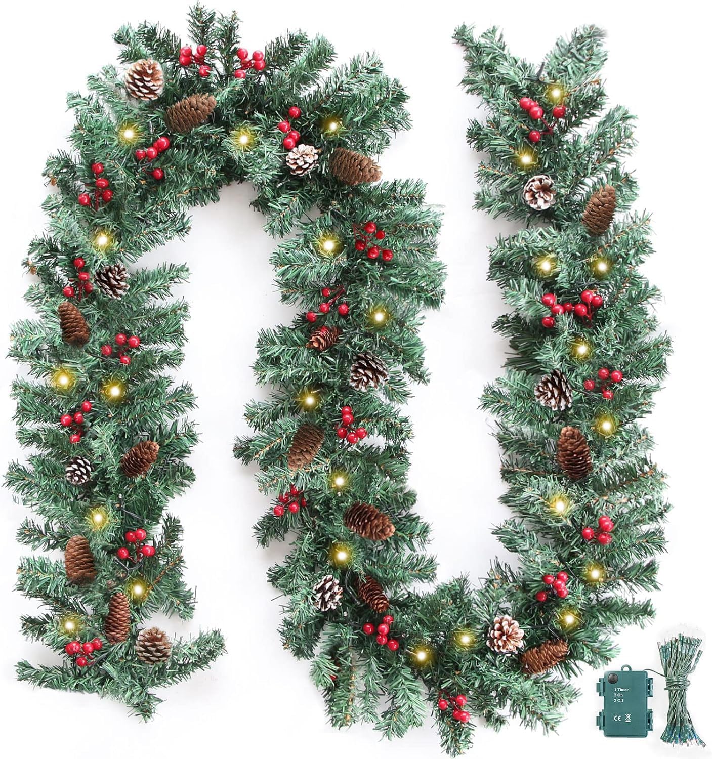 ZIFTY 9FT Christmas Garland with 50LED String Lights Battery Timer Operated Pre-lit Garland Christmas Decoration Greenery Pine Garland Xmas Mantle Garland for Fireplace Holiday Home Indoor Outdoor