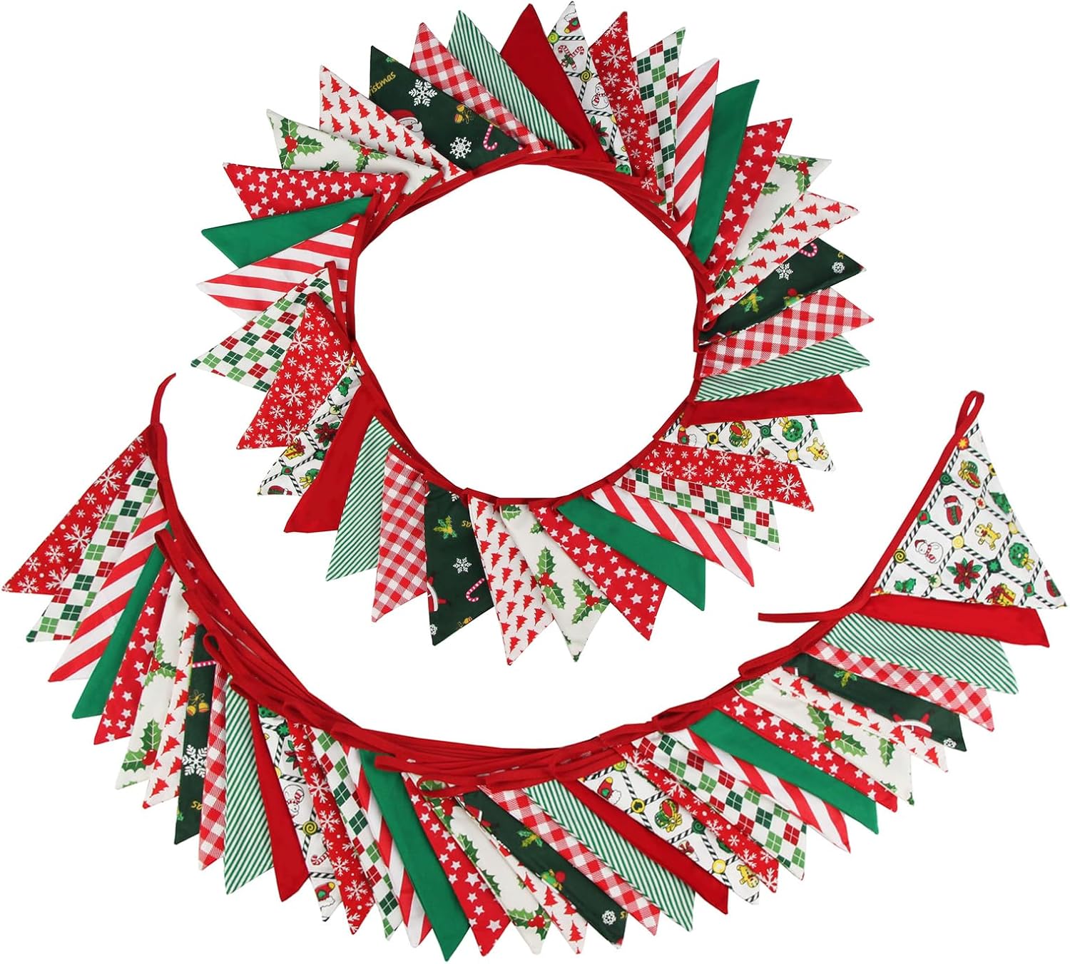 🎄【Package Contains】1pack 10M/32ft red green christmas fabric pennant banner triangle flag bunting with 36 flags. Size of each flag: 15.5cm x 15.5cm/6.1in x 6.1in(Length x Width).🎅【Unique Design & High Quality】These red green white christmas pennant banner fabric triangle flag garland bunting are made of high quality cotton with patterns in classic xmas elements. The christmas fabric pennant banner bunting with neatly cut, sewn in double-layer, which is durable and reusable, make your christmas party decoration more colorful and enhance the xmas atmosphere.
